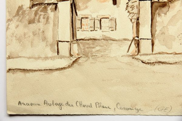 - Description: Detail of a farmstead from the 19th or early 20th century. At the lower edge of the sheet is the handwritten inscription “Ancienn Auleige[?] du Cheval Blanc, Carouge (GE)” and the artist’s signature.