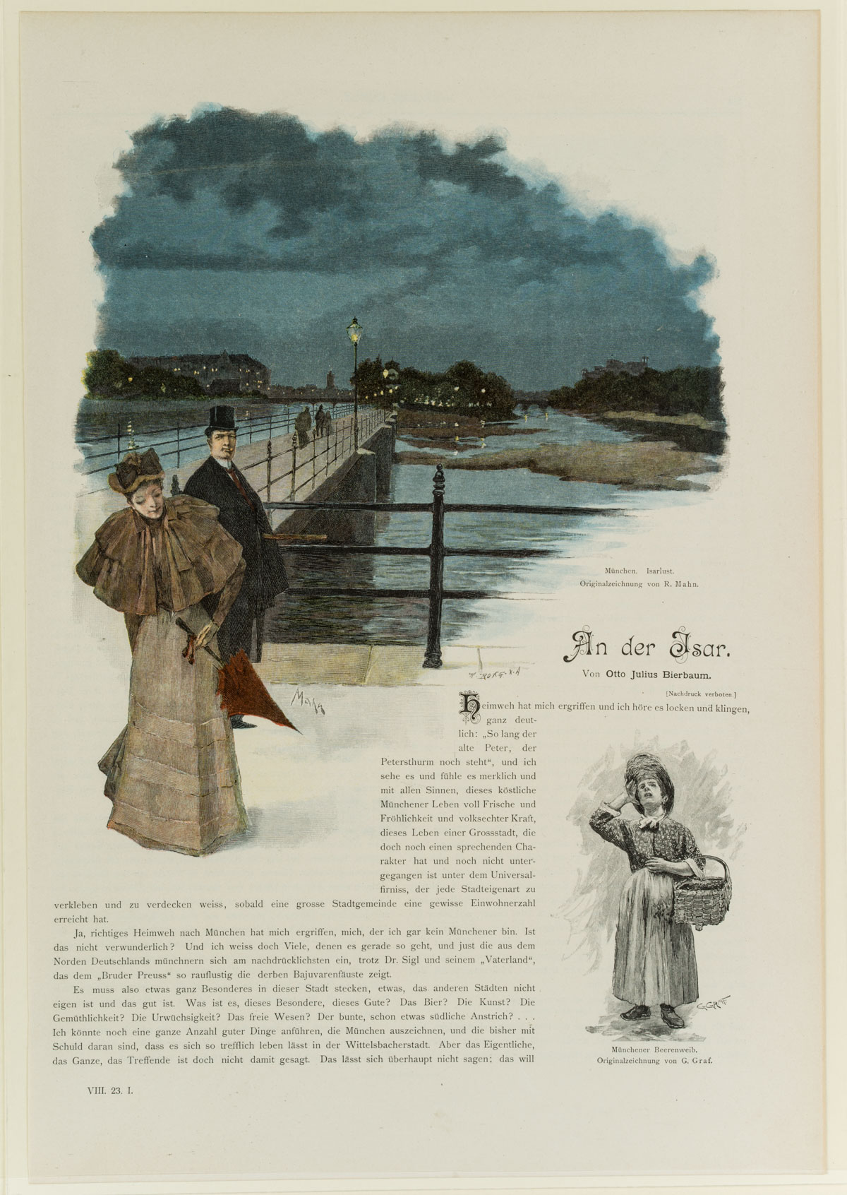 - Beschreibung: Bezeichnet in der Darstellung “Mahn”, bezeichnet rechts “R. Bong X.A.”, bezeichnet rechts “Originalzeichnung von R. Mahn”. Nächtliche Szene am Ufer der Isar, wo sich eine Frau in adrettem Kostüm, in Begleitung eines Mannes zeigt. Im Hintergrund führt ein Weg entlang des Flusses, der nur spärrlich von Straßenlaternen beleuchtet wird.