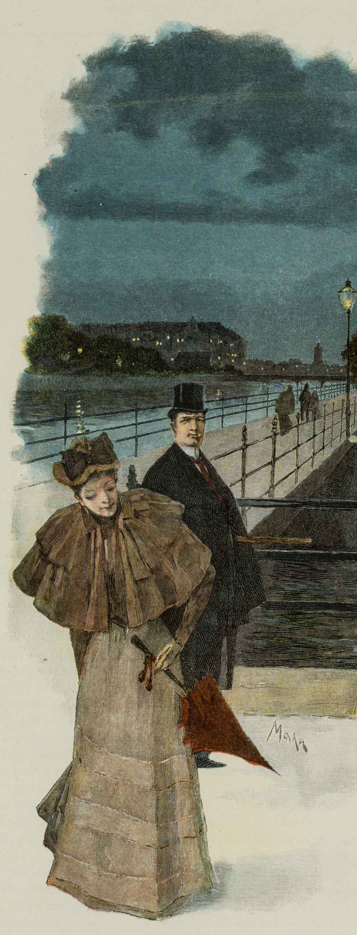 - Description: Inscribed in the image “Mahn”, inscribed on the right “R. Bong X.A.”, inscribed on the right “Original Zeichnung von R. Mahn”. Nocturnal scene on the banks of the Isar, where a woman in neat costume, accompanied by a man, shows herself. In the background a path leads along the river, which is only sparsely lit by street lamps.