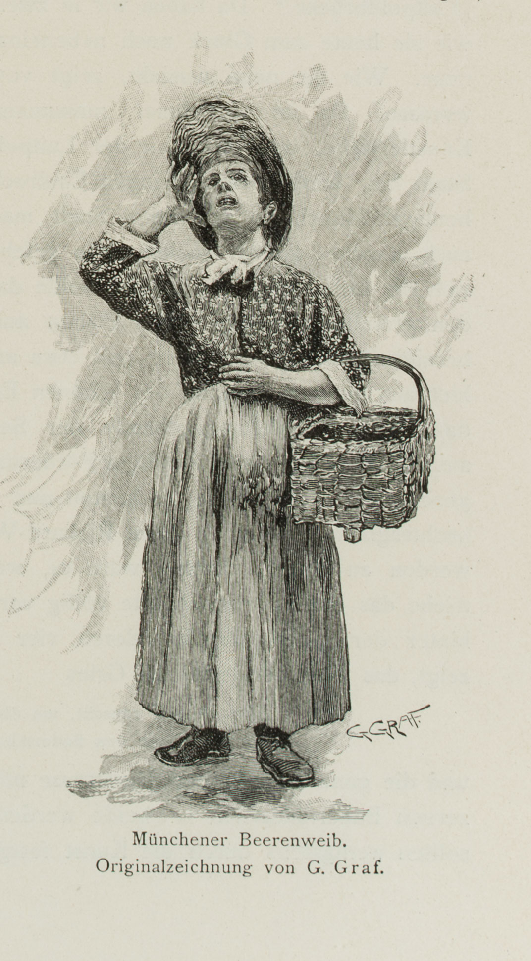 - Inscription: Below the depiction an ode to the Isar by the writer Otto Julius Bierbaum (1865 Grünberg-1910 Dresden). Next to it a depiction of a Munich berry woman, after G. GRAF.