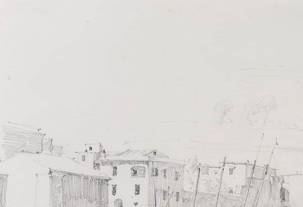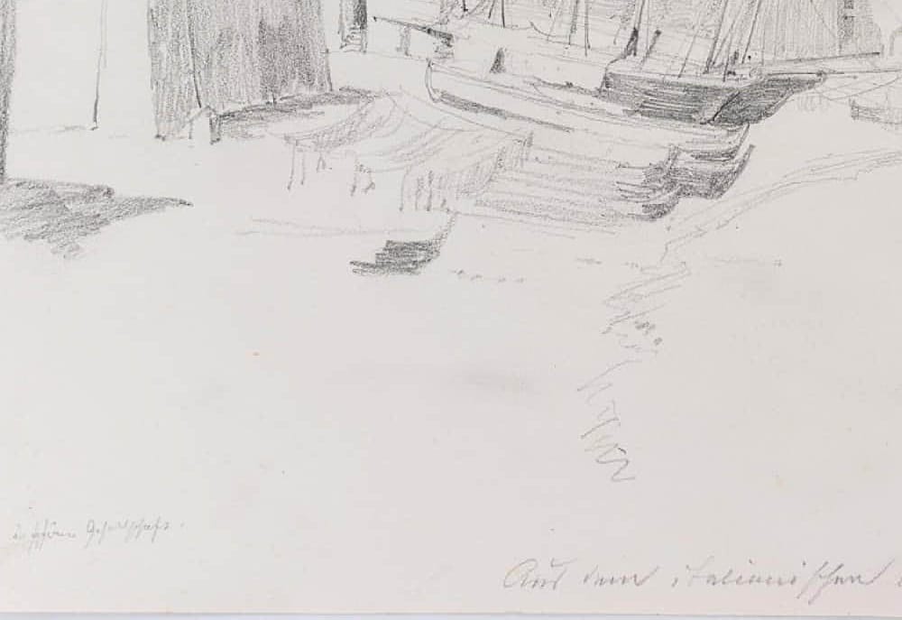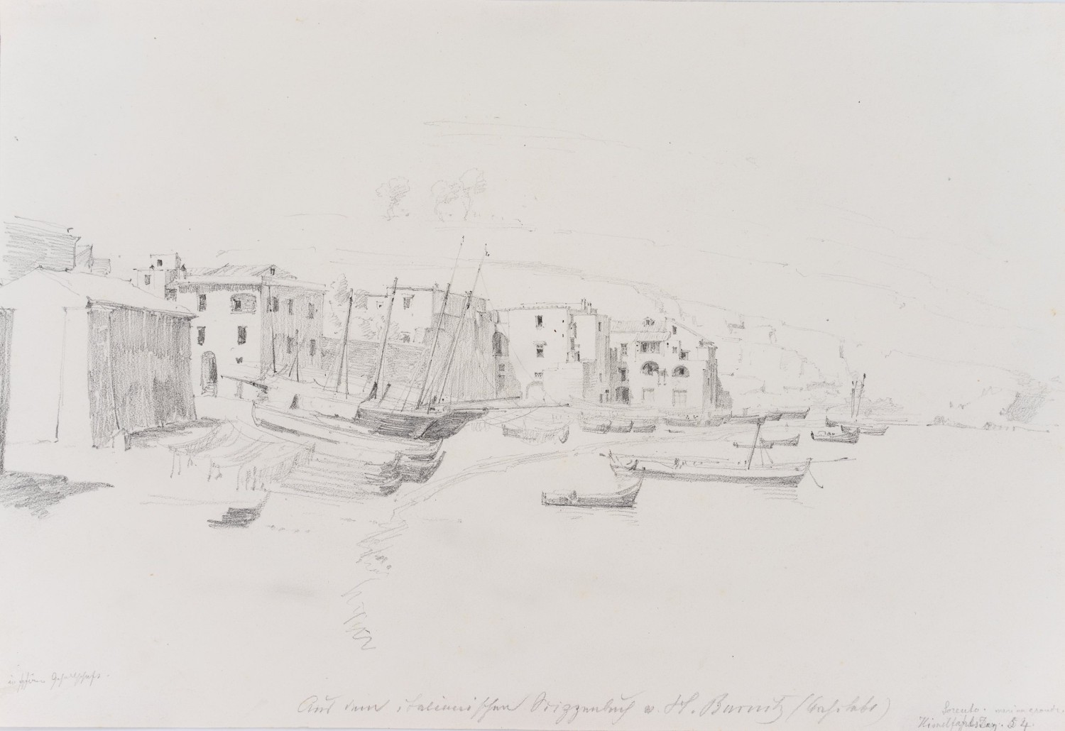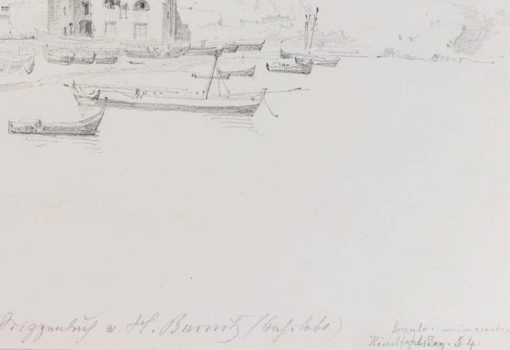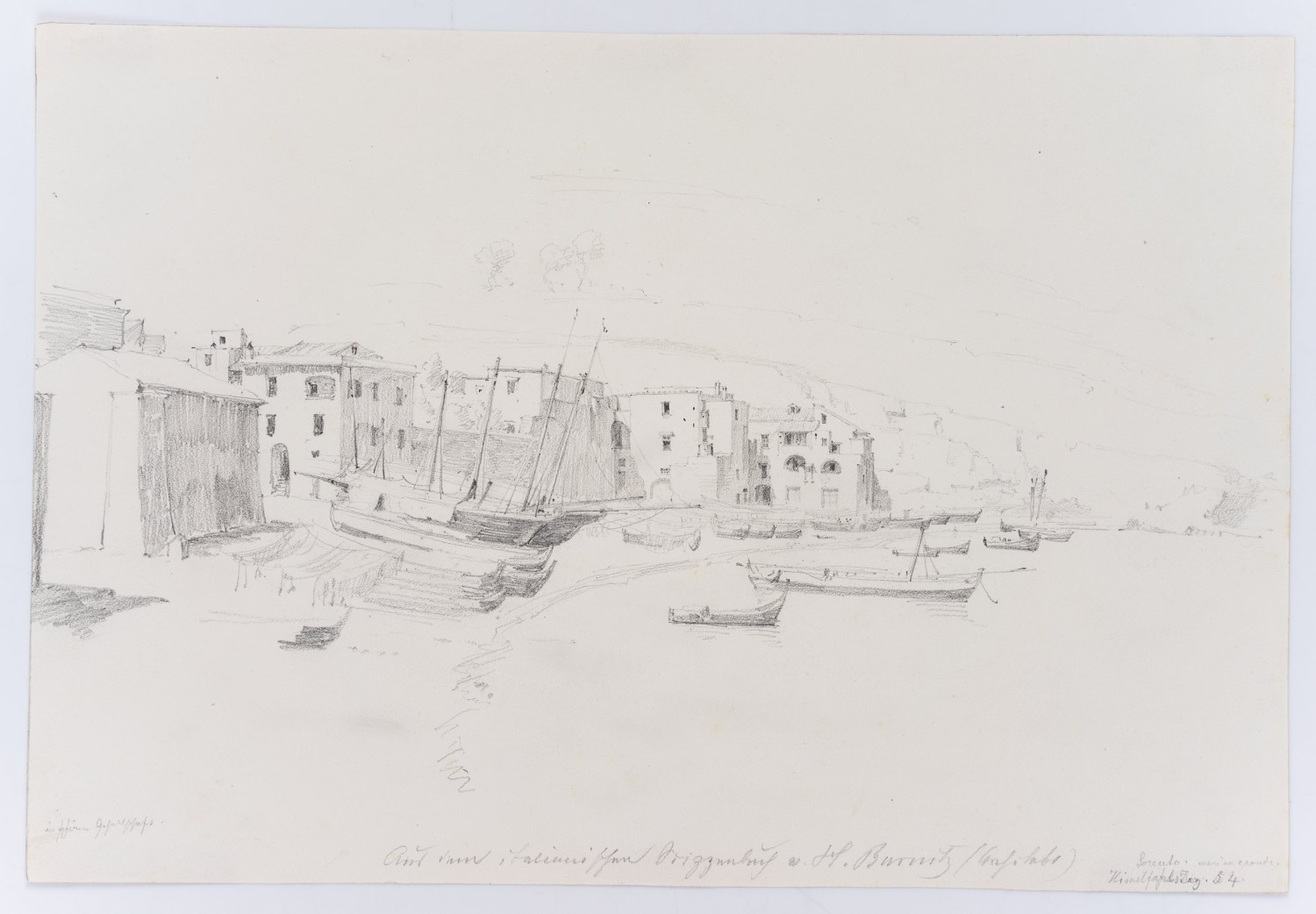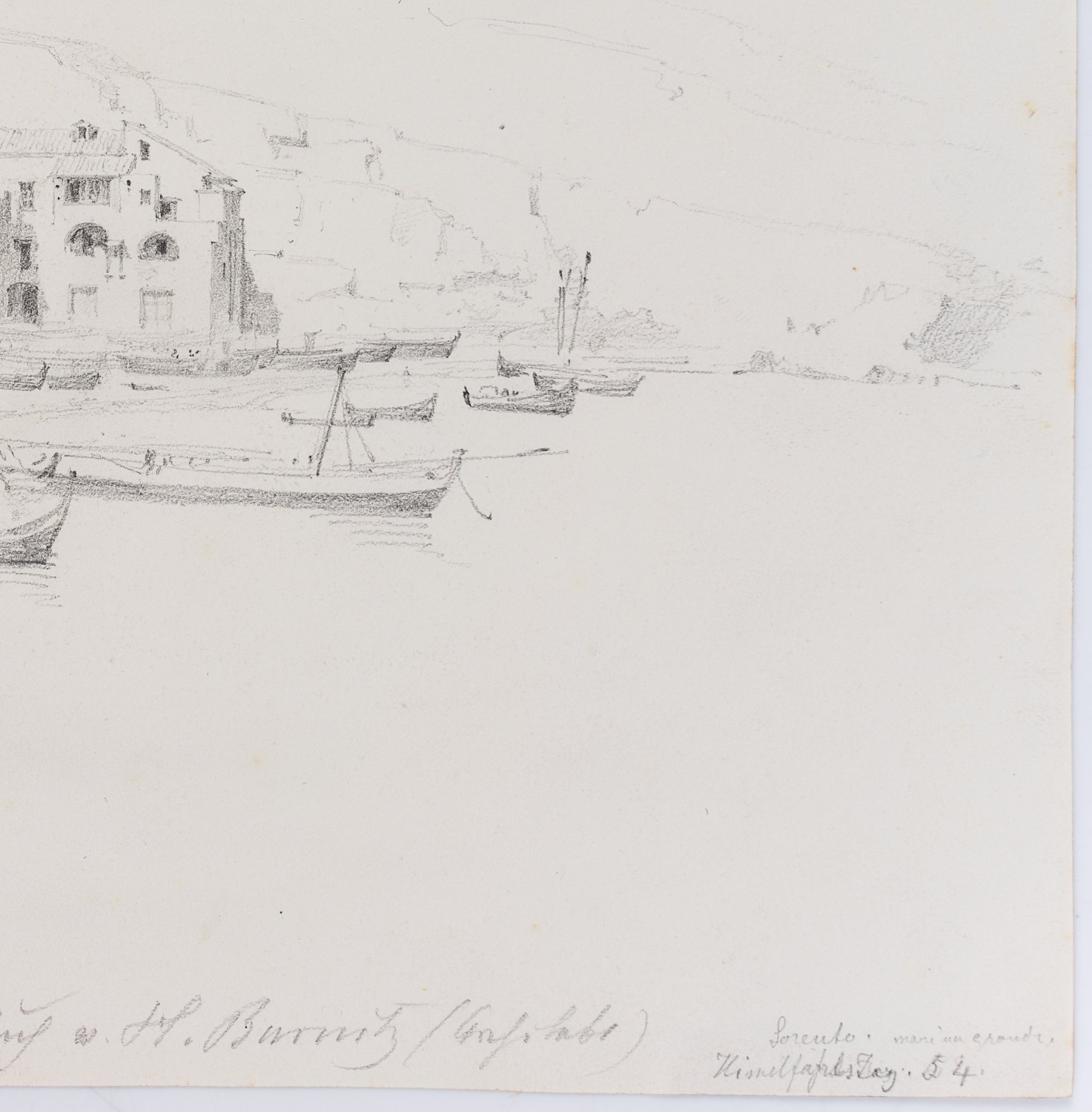 Rudolf Heinrich Burnitz (1827 Frankfurt on the Main – 1880 ibid.), Bay of Sorrento with boats in the harbour, “Via Marina Grande”, Gulf of Naples, 1854, Pencil