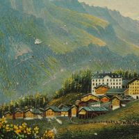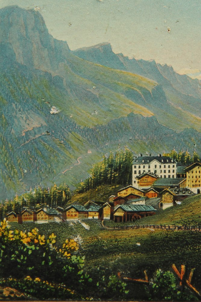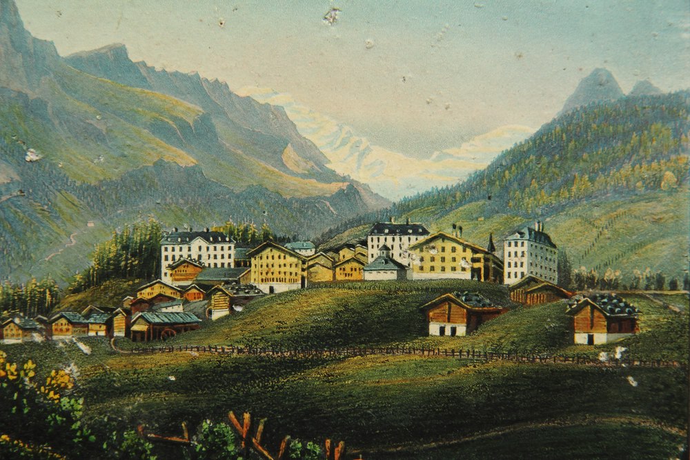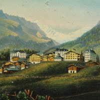 - Description: Beautiful landscape depiction of the village of Leukerbad in the Dala valley in front of a varied alpine panorama with wooded slopes, rocky peaks and a glacier in the background.