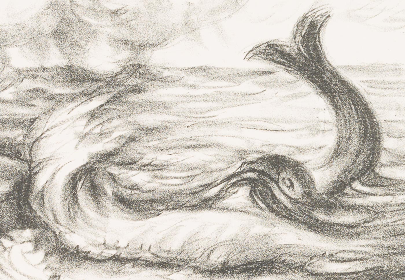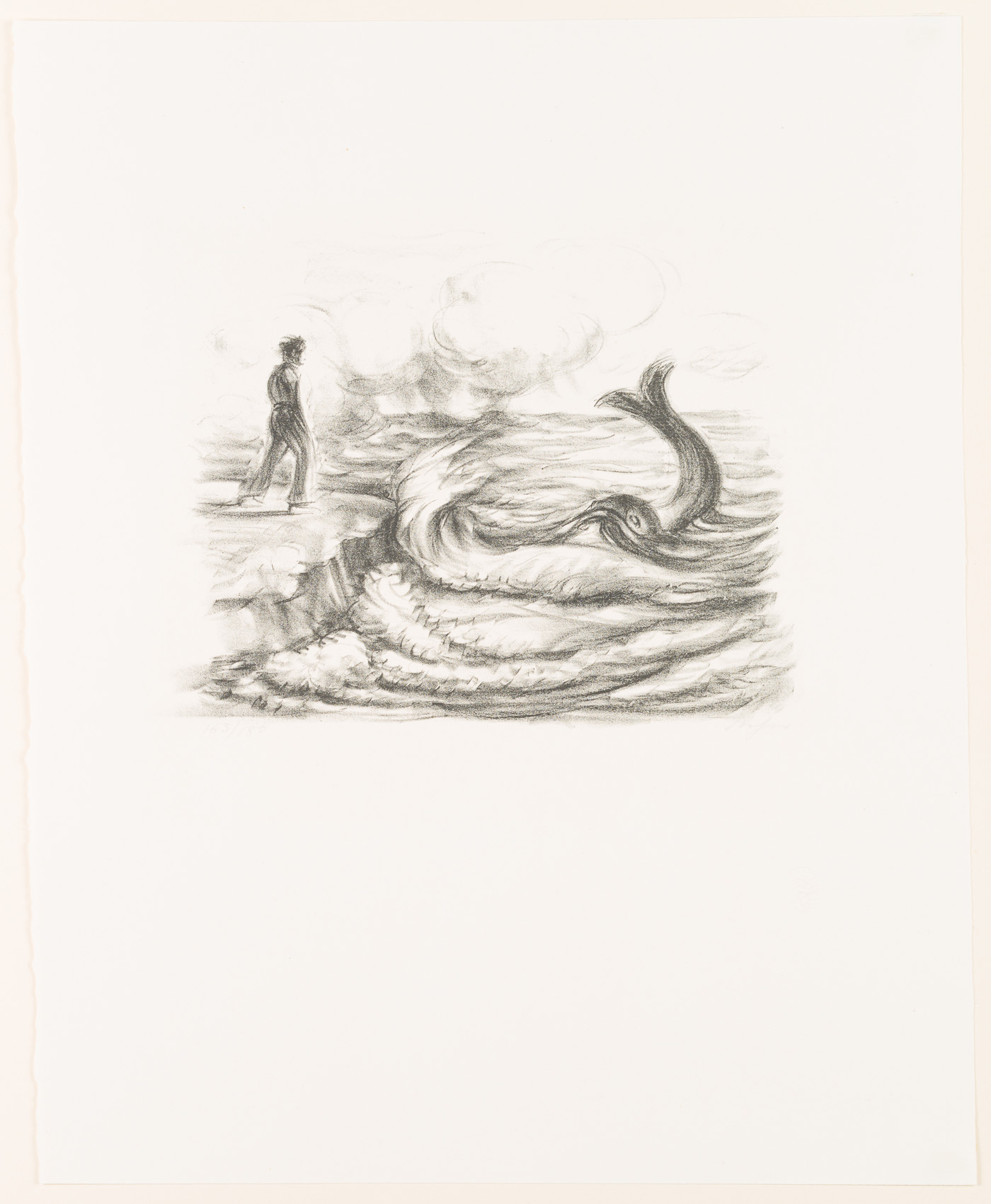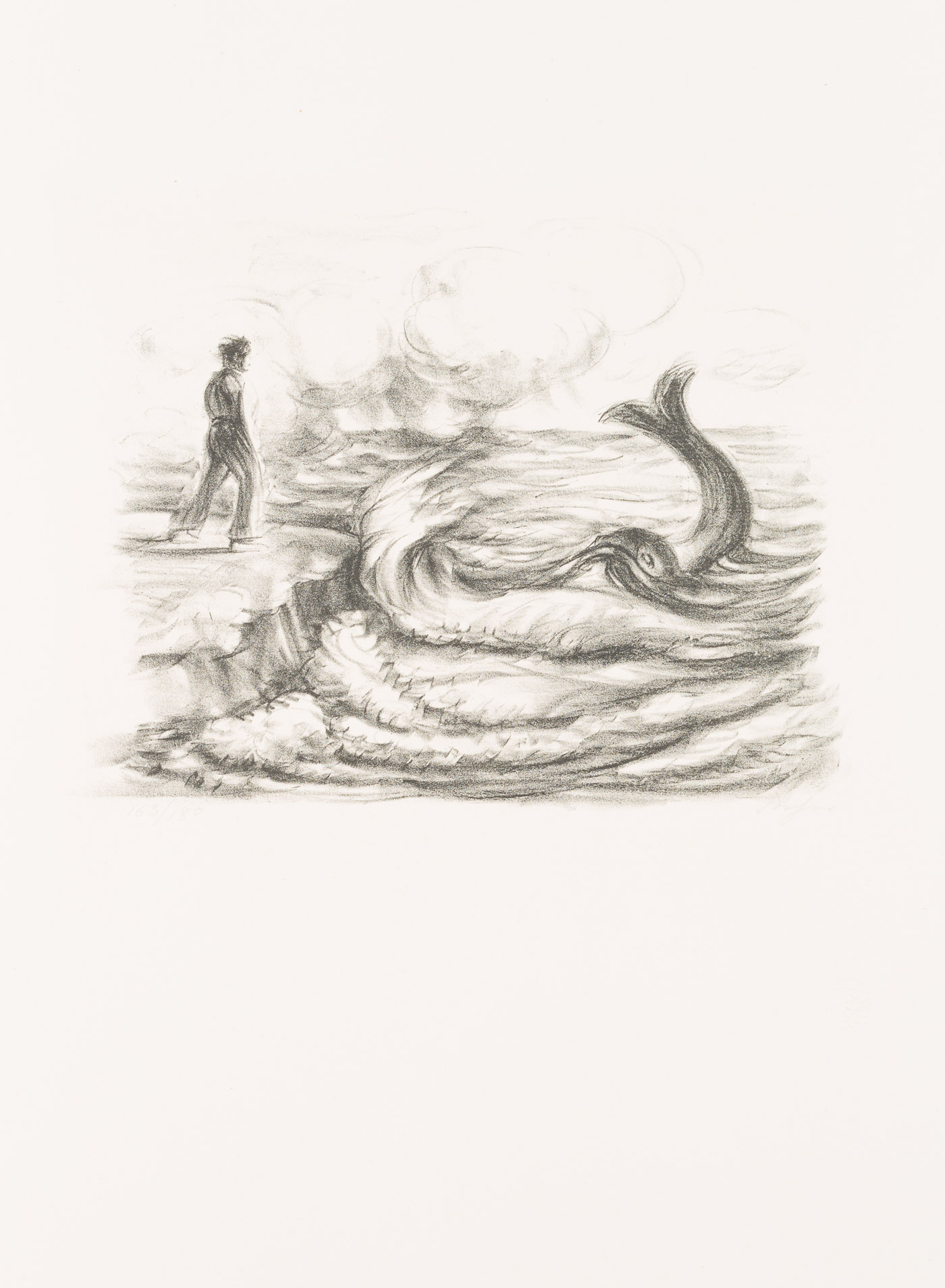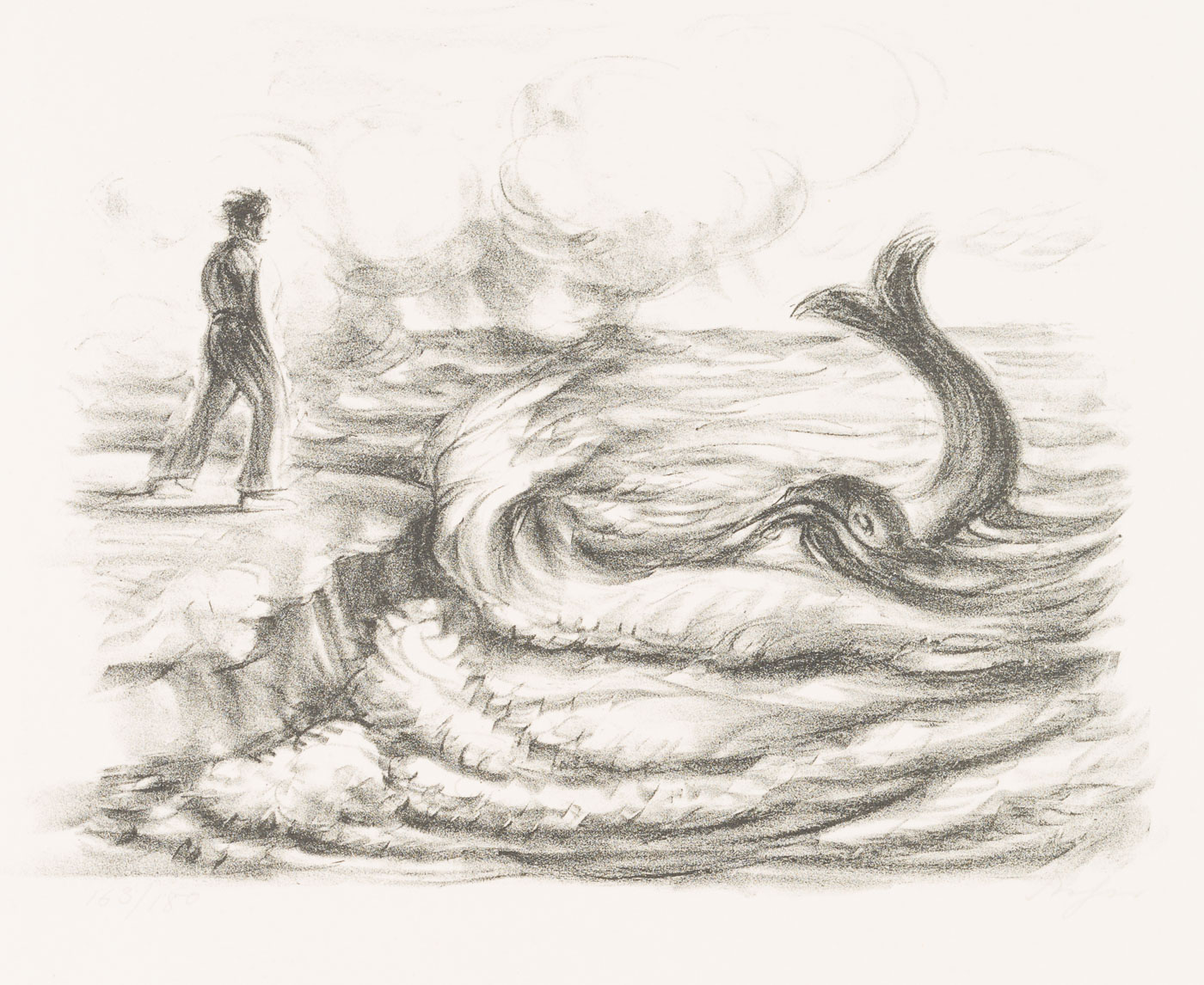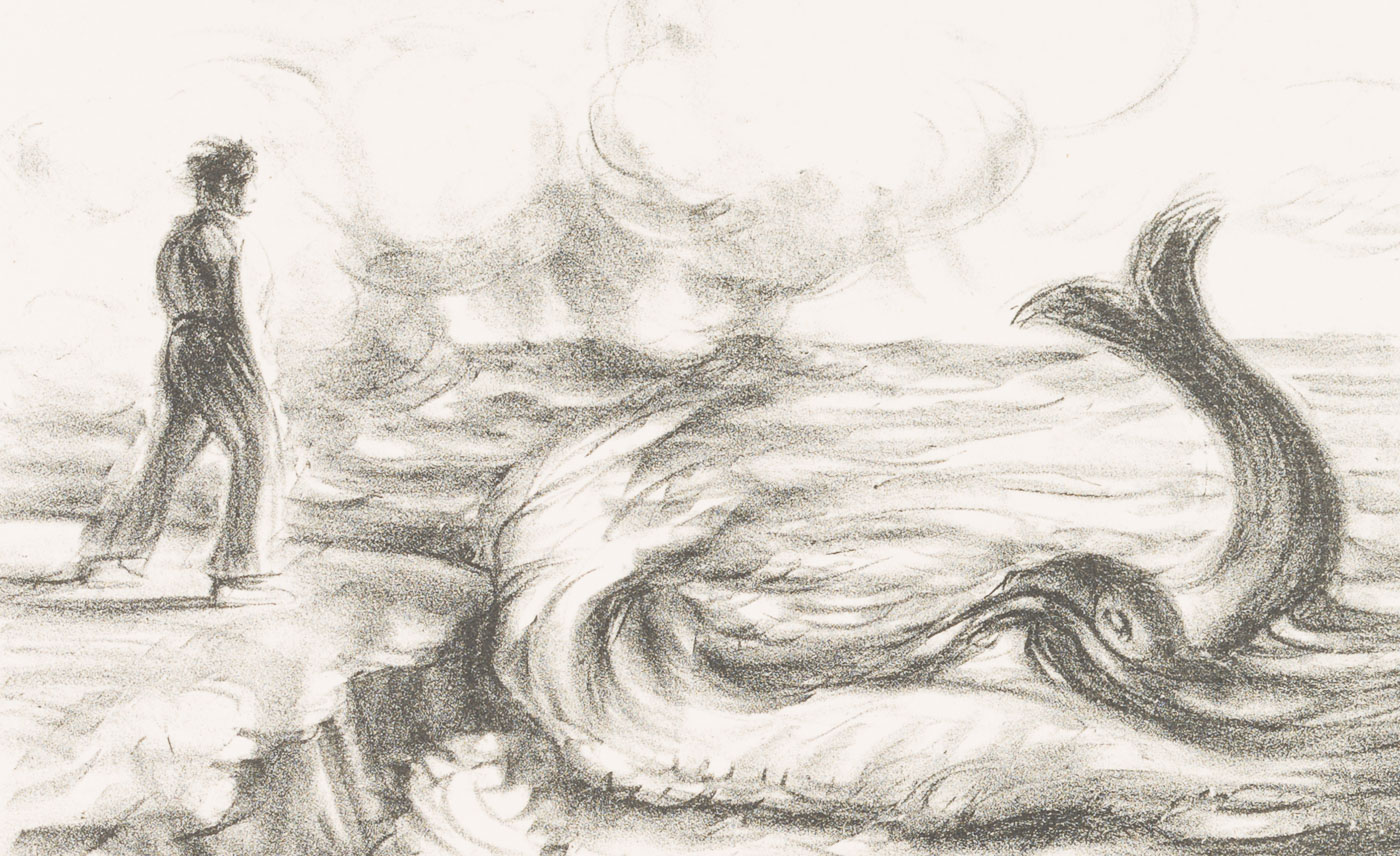 On the shore of a sea, standing on a rocky outcrop, the viewers catch sight of a male figure. The wind blows away her hair and makes the waves break with force on the shore. Then, in the midst of the waves, a large fish stretches its dorsal fin out of the water. It seems as if the two figures had met by chance. The depiction shows the fisherman calling the butt again to make a wish. From this scene comes the verse that has become famous: “Manntje, Manntje, Timpe Te, | Buttje, Buttje inne See, | myne Fru de Ilsebill | will nicht so, as ik wol will.” - Keywords: 20th century, Expressionism, Animals, Germany,