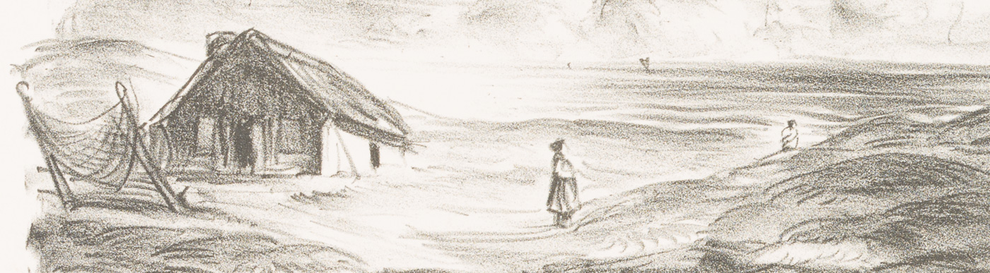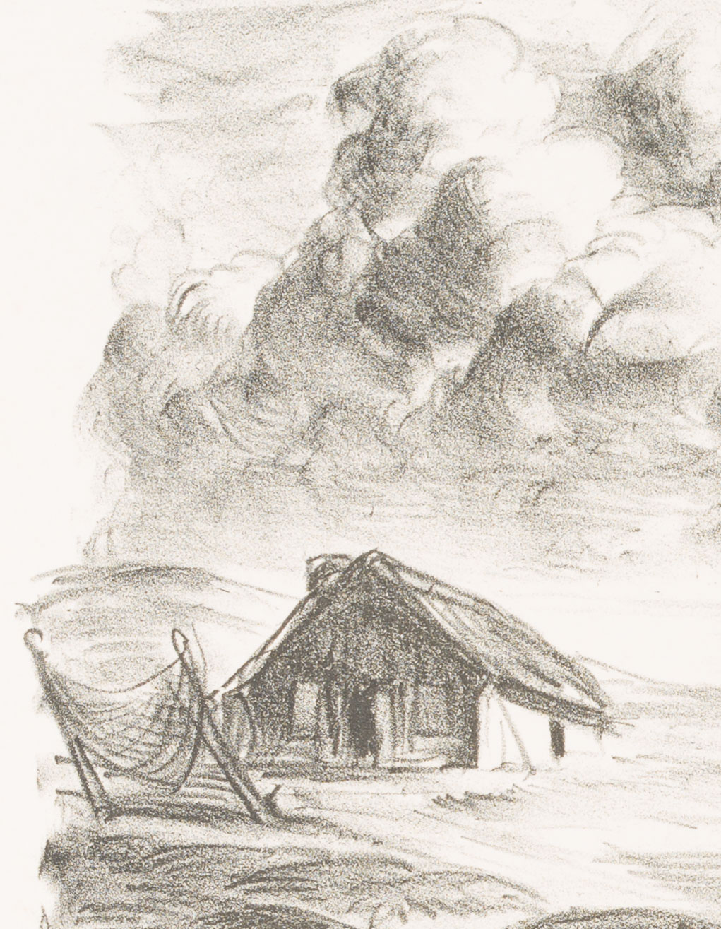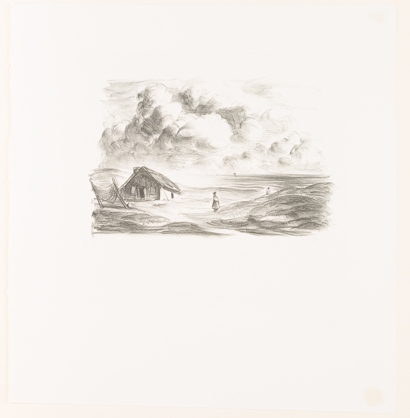 In sanften Hügeln liegend, erblicken die Betrachtenden im Mittelgrund ein kleines Häuschen. Vor diesem, auf zwei Pflöcken hängend, ein Fischernetz. Mittig die Silhouette einer Frau, womöglich der Bewohnerin des Hauses. Im Hintergrund die weite See, über der sich die Wolken türmen. - Schlagworte: Landschaft, Deutschland, Expressionismus, 1900-1924