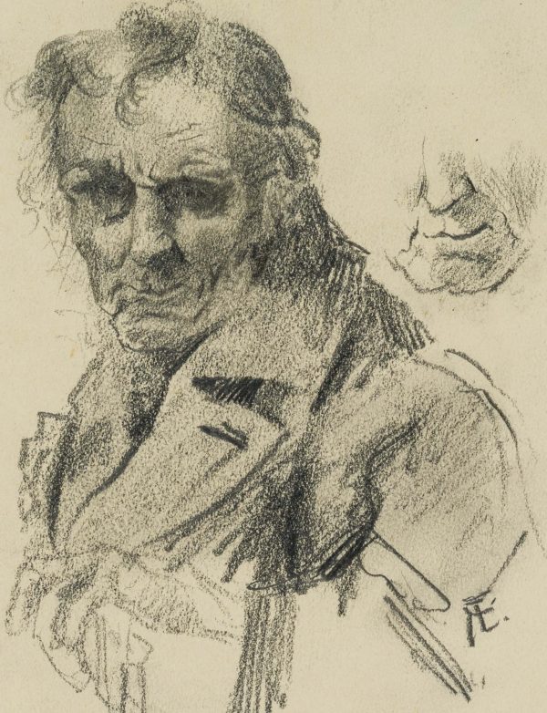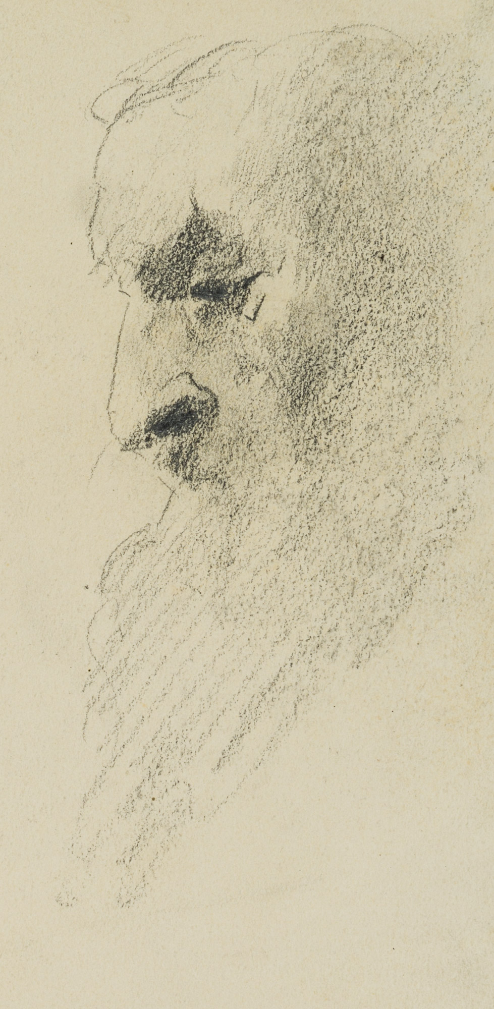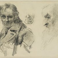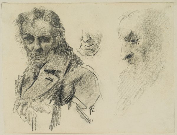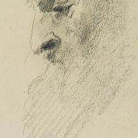 - Description: On the verso is the collector’s stamp R.S. twice (Lugt number L.2239b). Portrait study of a man in elegant clothing. The laterally turned upper part of the body is executed to about chest height, the face has been distinguished with details such as the wrinkled temple and forehead area, which give the gentleman a serious expression. With a few strokes, the artist succeeds in modelling the face through deep dark areas, such as those of the eyes, and light ones, such as those of the forehead. In his countenance we also see an echo of the striking mouth and chin, as the artist tried them out in the middle depiction. To the right, profile depiction of an older man with a long beard.