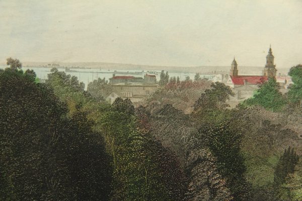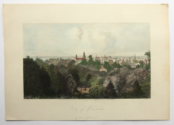 - Beschreibung: Nach einer Vorlage von Asa Coolidge Warren (1819 Boston, Massachusetts – 1904 New York). Von einem erhöhten Standort im Landesinneren geht der Blick über eine Promenade mit flanierenden Damen und Herren zu der Stadt Milwaukee und dem dahinterliegenden atlantischen Ozean. Mittig hebt sich aus der Silhouette der Stadt der Turm der Kathedrale der Stadt empor.