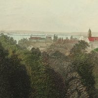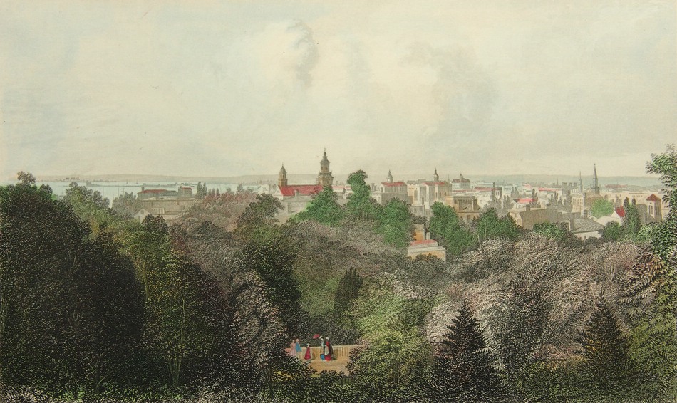 - Description: After an original by Asa Coolidge Warren (1819 Boston, Massachusetts – 1904 New York). From an elevated position in the interior, the view goes over a promenade with strolling ladies and gentlemen to the city of Milwaukee and the Atlantic Ocean beyond. In the centre, the tower of the city’s cathedral rises from the silhouette of the city.