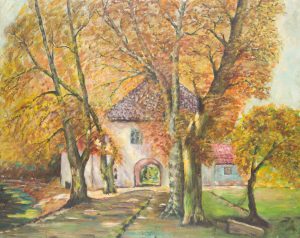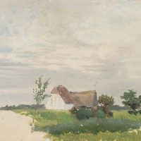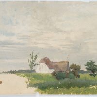 - Keywords: Oil sketch, sketch, nature study, North German landscape, North Germany, meadow, expanse, tree, farm, thatched roof, thatched roof, low horizon, summer