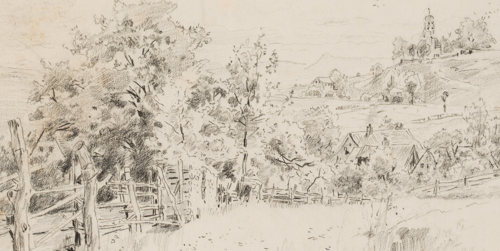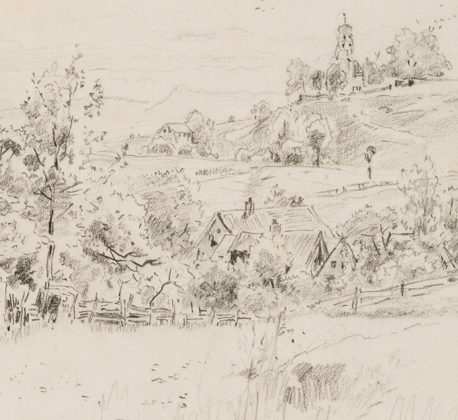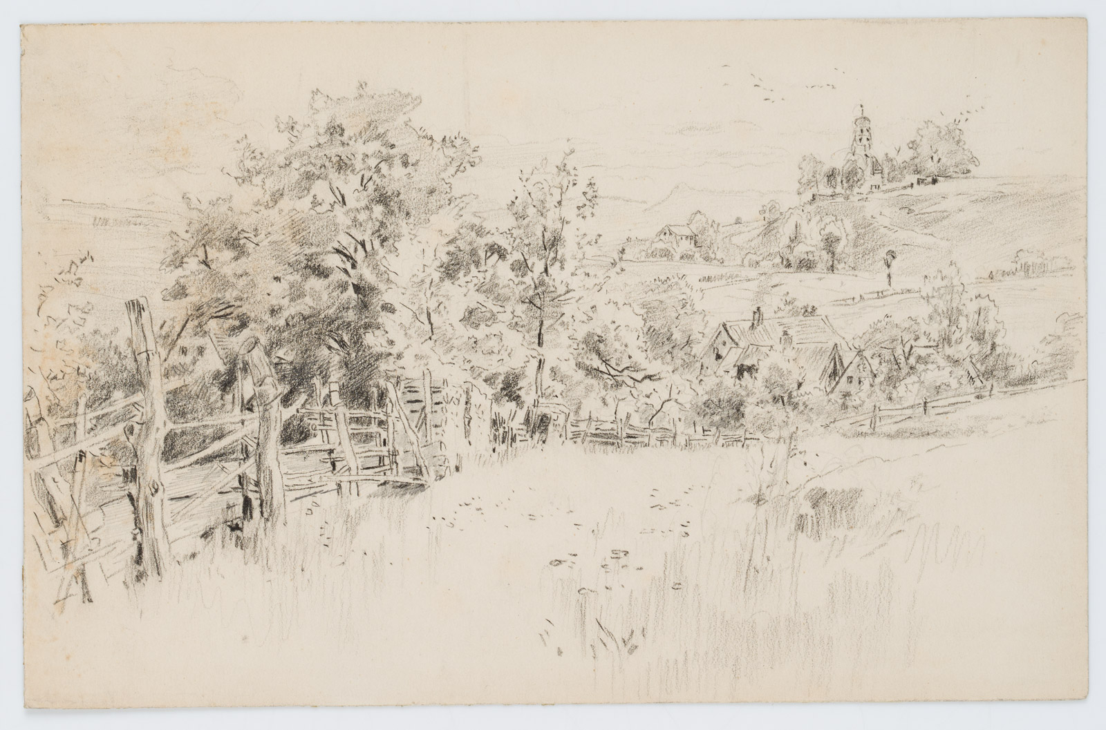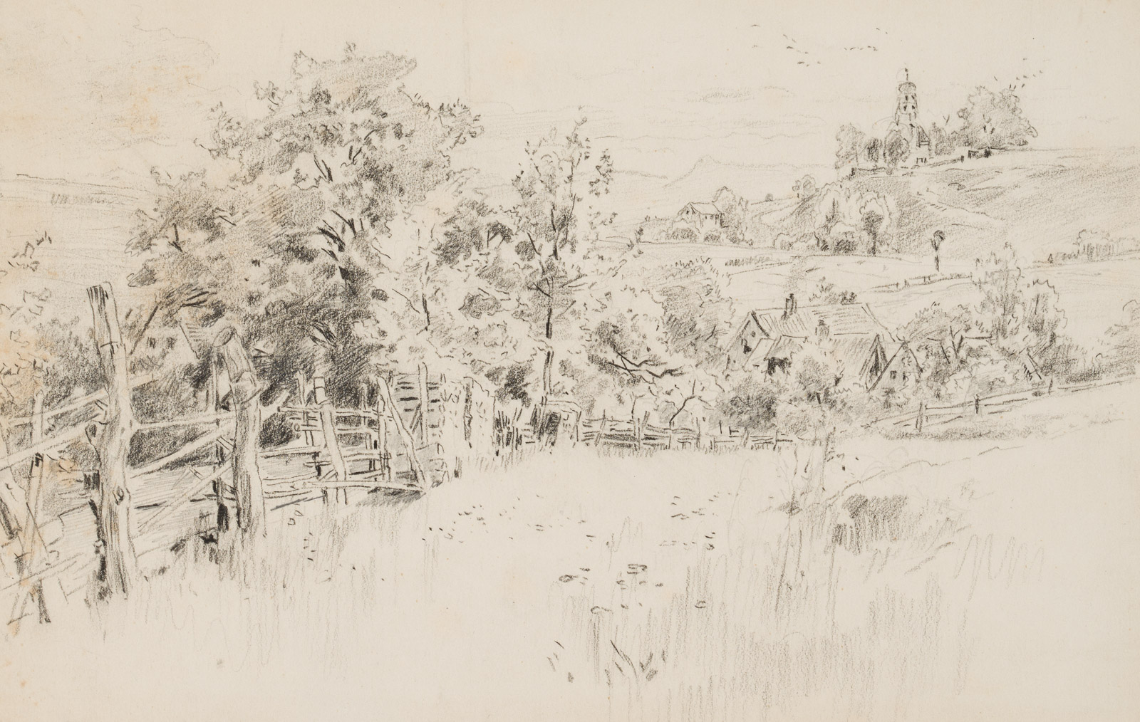 Richard Püttner (1842 Wurzen – 1913 München), PÜTTNER, Hügelige Wiesenlandschaft mit Zwiebelkirchturm., 19. Jahrhundert, Bleistift