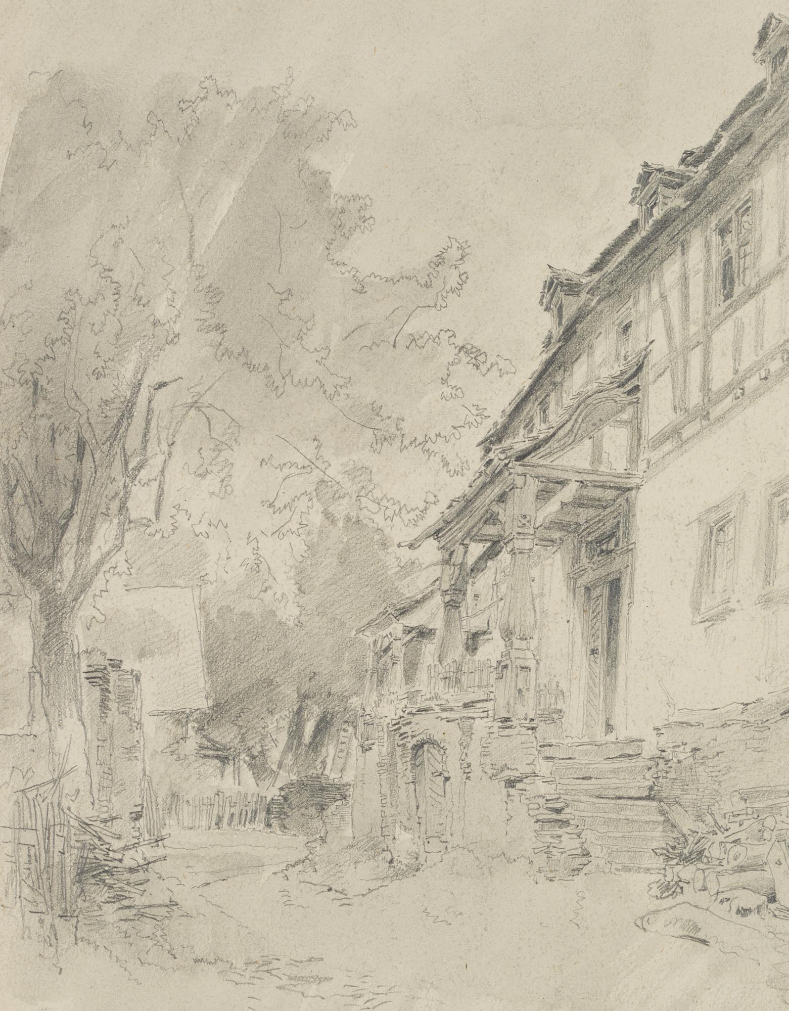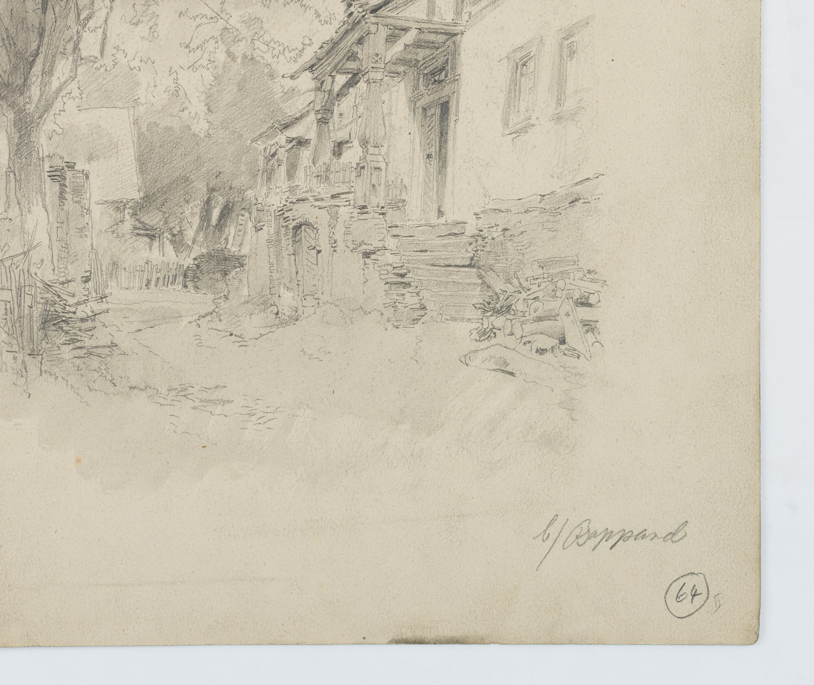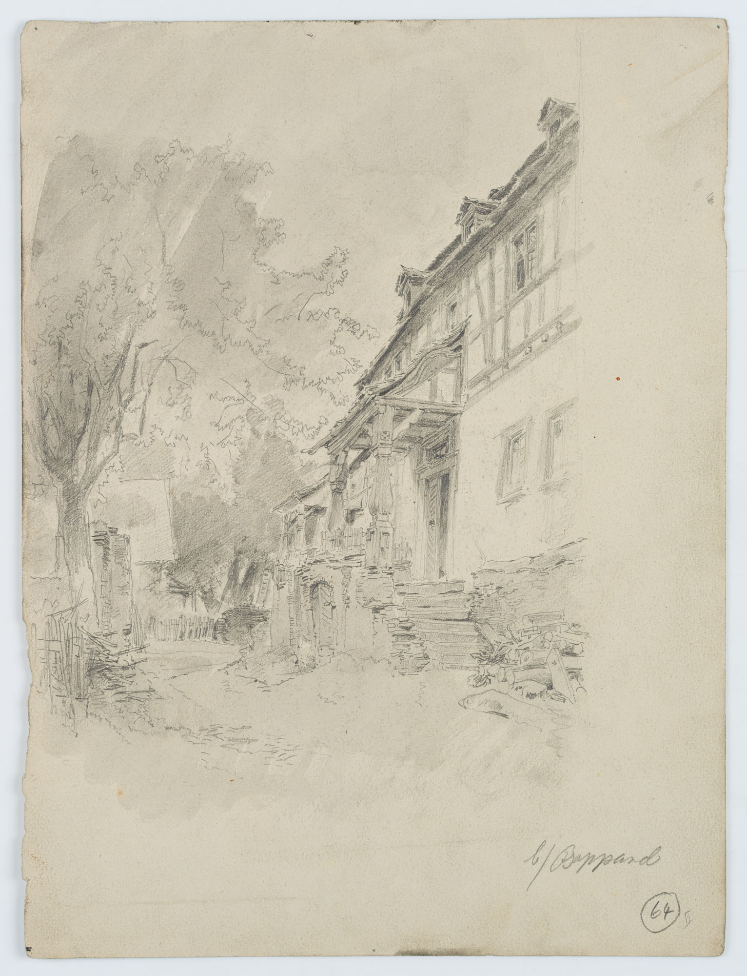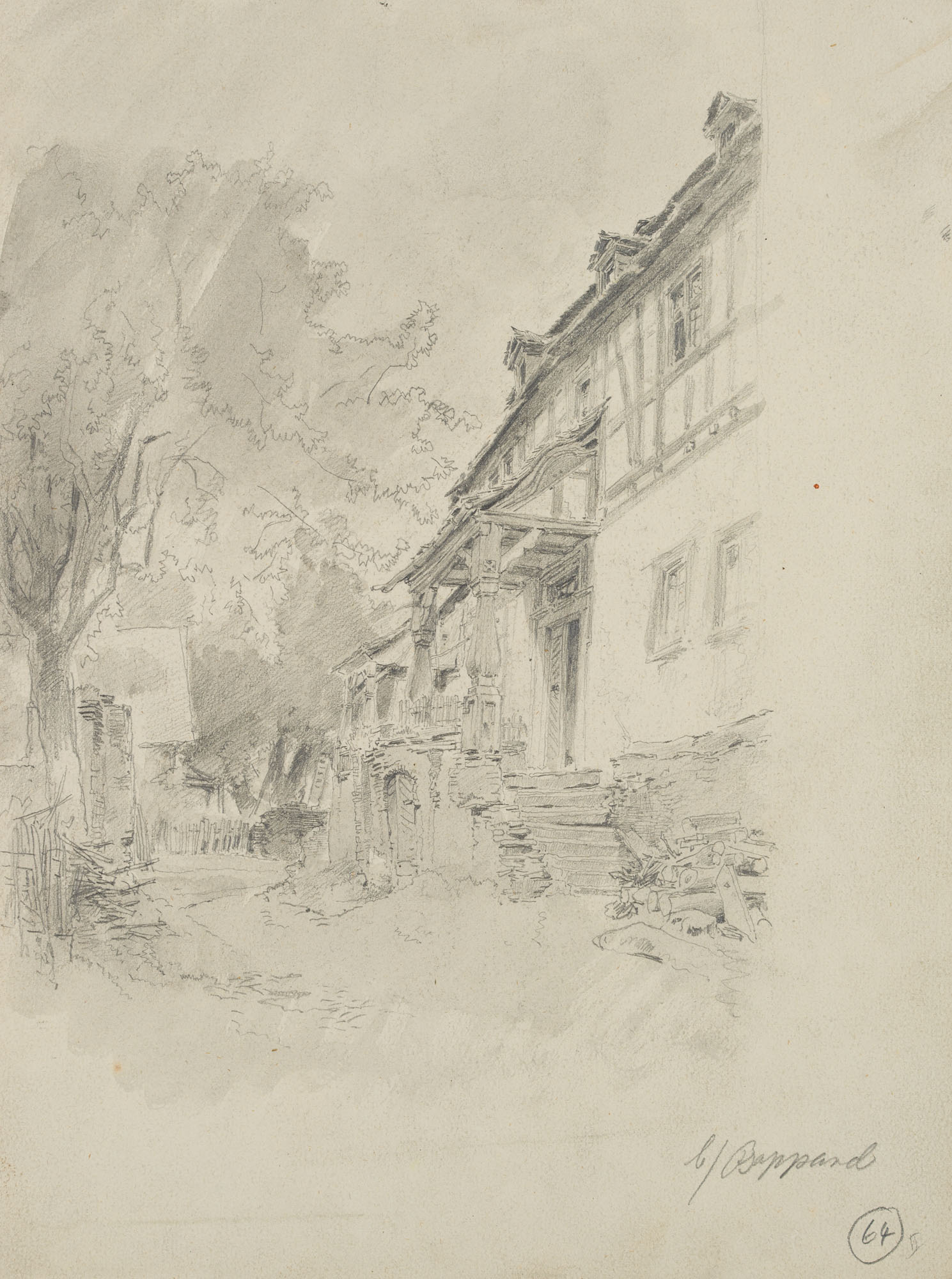 Richard Püttner (1842 Wurzen – 1913 München), PÜTTNER, Straße in Boppard mit Fachwerk. Mittelrheintal., 19. Jahrhundert, Bleistift