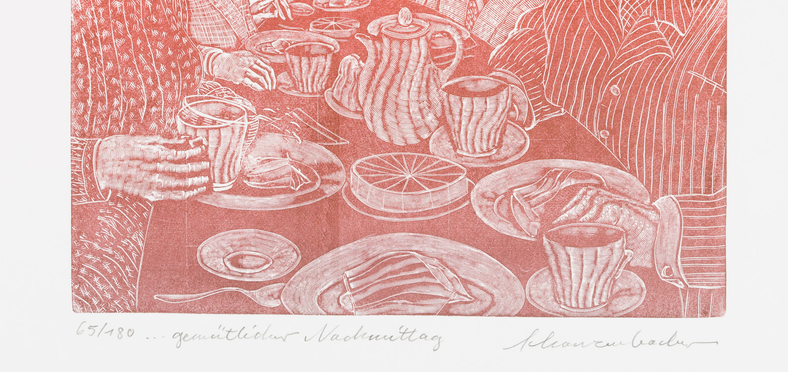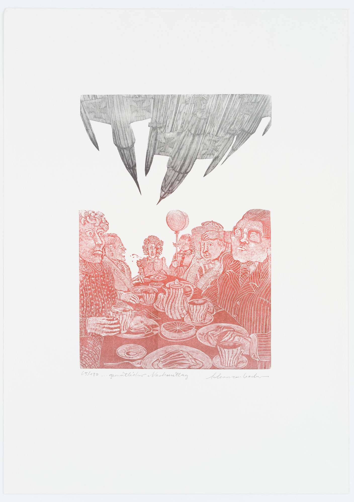 Robert Schanzenbacher (*1950 Sulzbach am Main), ‘Gemütlicher Nachmittag’ mit Düsenjet, um 1980, Holzschnitt