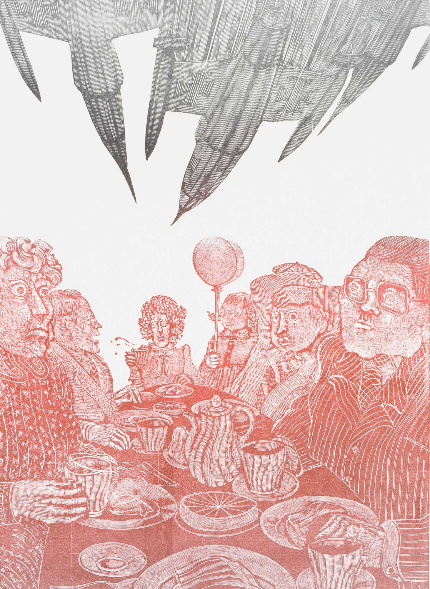Robert Schanzenbacher (born 1950 Sulzbach on the Main), Cosy afternoon’ with jet plane, c. 1980, Woodcut