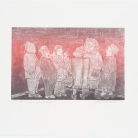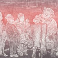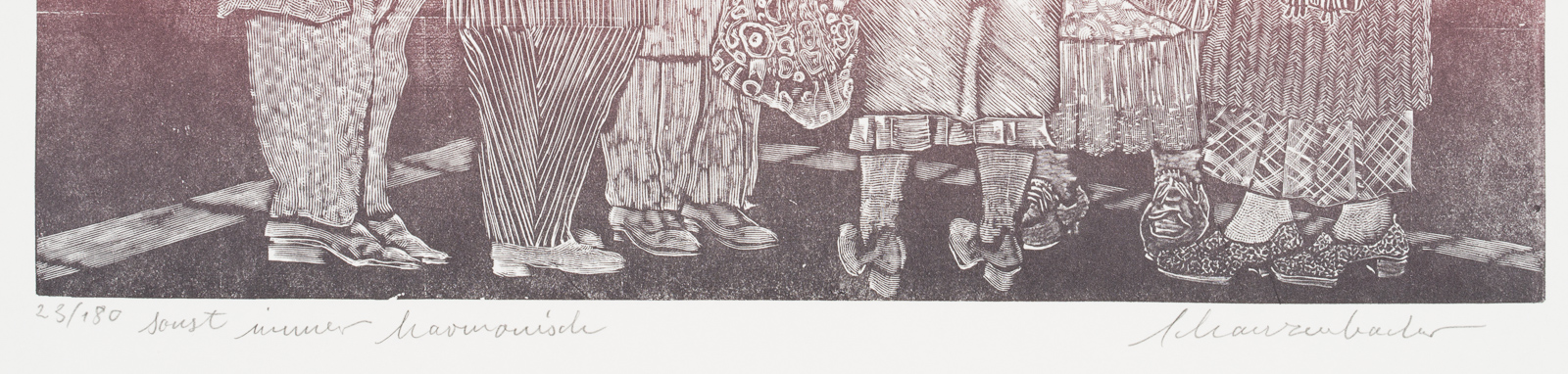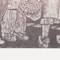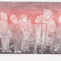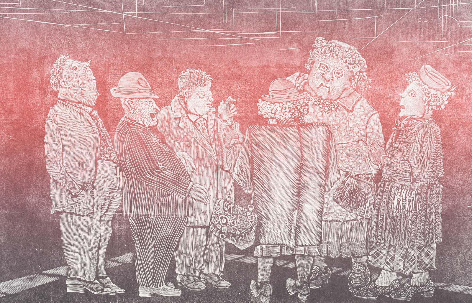 Robert Schanzenbacher (*1950 Sulzbach am Main), Karikatur. Gruppe Griesgrämiger, um 1980, Holzschnitt