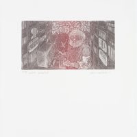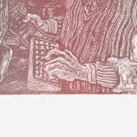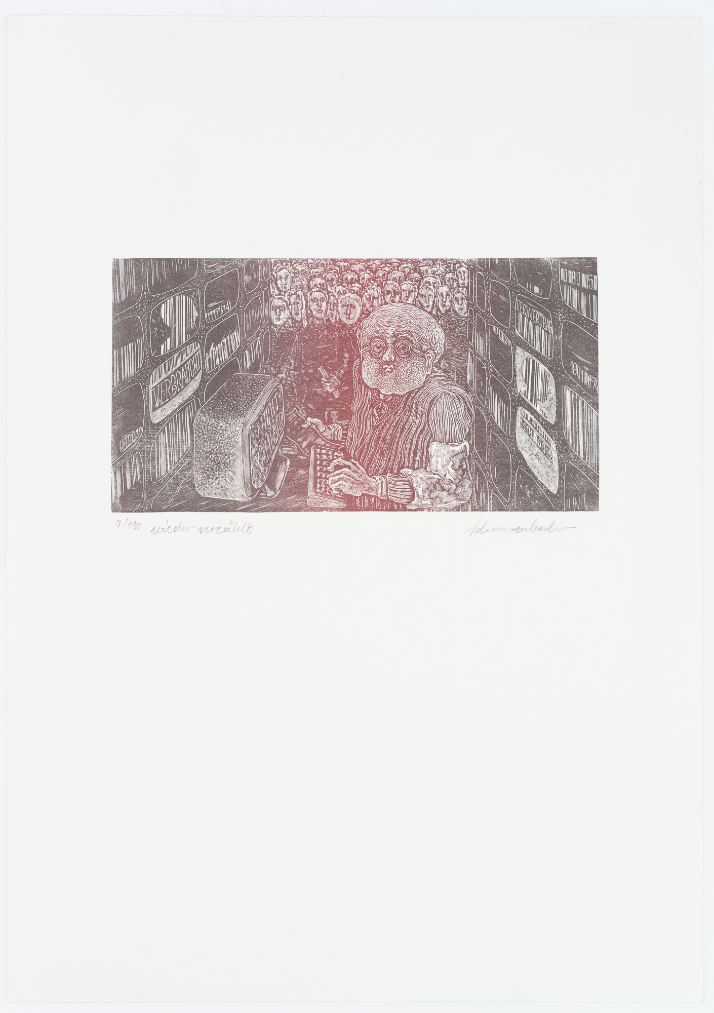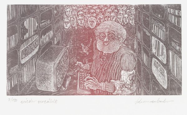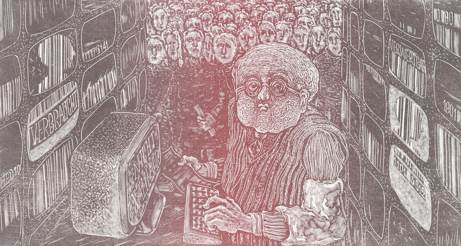 Robert Schanzenbacher (born 1950 Sulzbach on the Main), Caricature with archivist on computer, 1980, Woodcut
