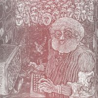Robert Schanzenbacher (*1950 Sulzbach am Main), Karikatur mit Archivar am Computer, 1980, Holzschnitt