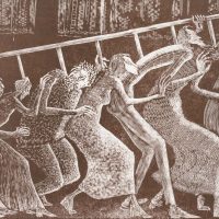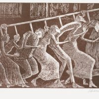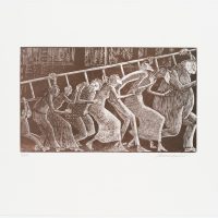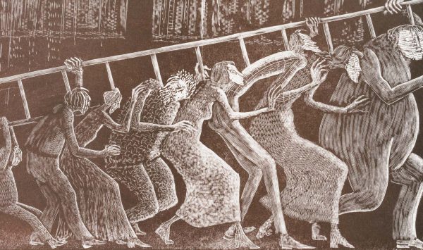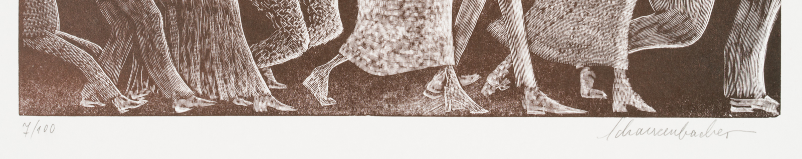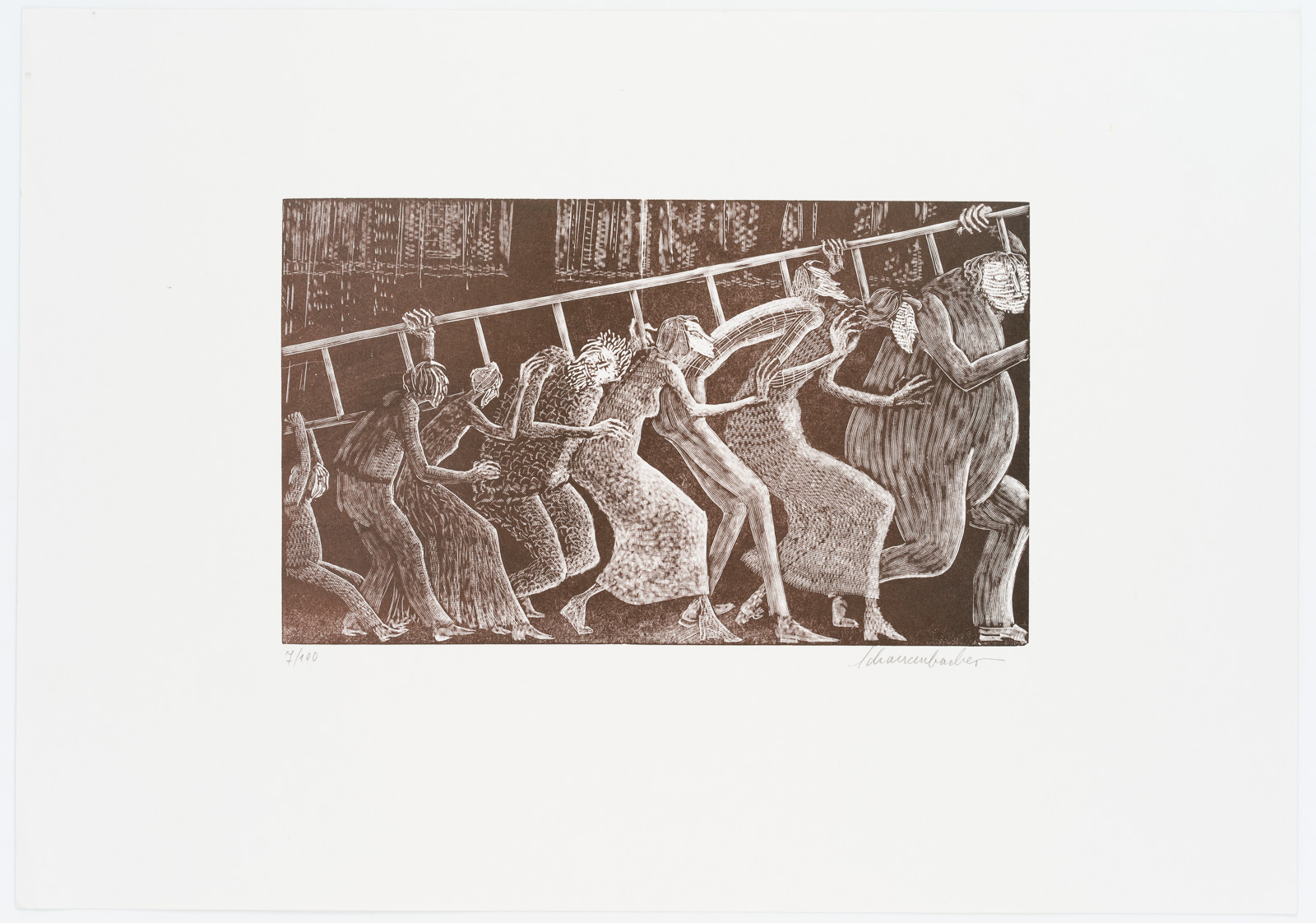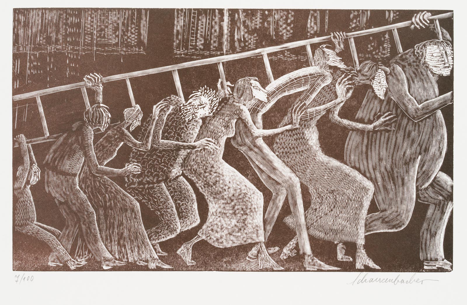 Robert Schanzenbacher (*1950 Sulzbach am Main), Karikatur mit Leiterträgern, 1980, Holzschnitt