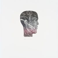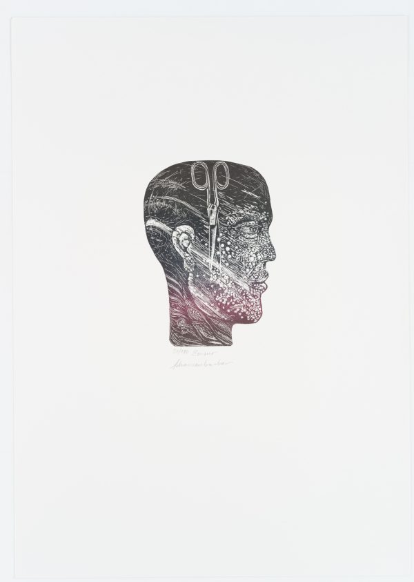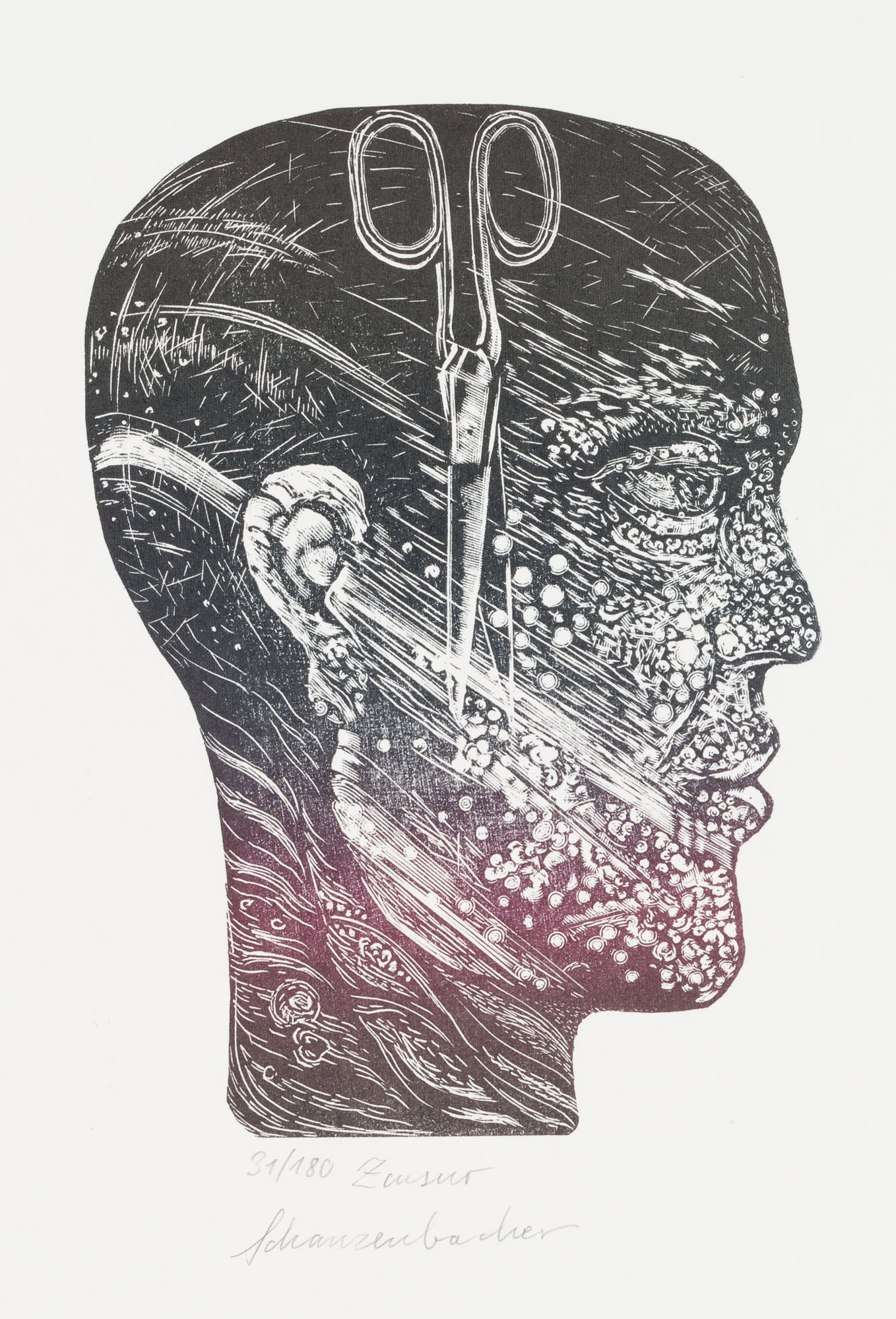 Robert Schanzenbacher (born 1950 Sulzbach on the Main), Caricature. Profile with scissors head, c. 1980, Woodcut
