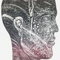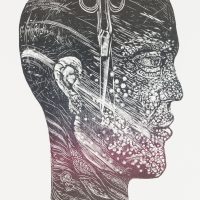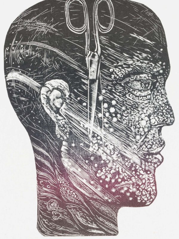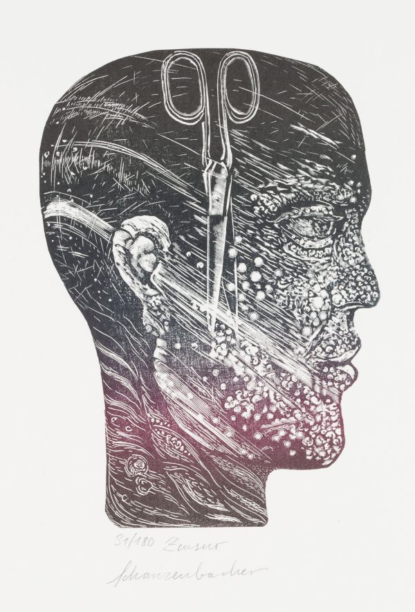 Robert Schanzenbacher (*1950 Sulzbach am Main), Karikatur. Profil mit Scherenkopf, um 1980, Holzschnitt
