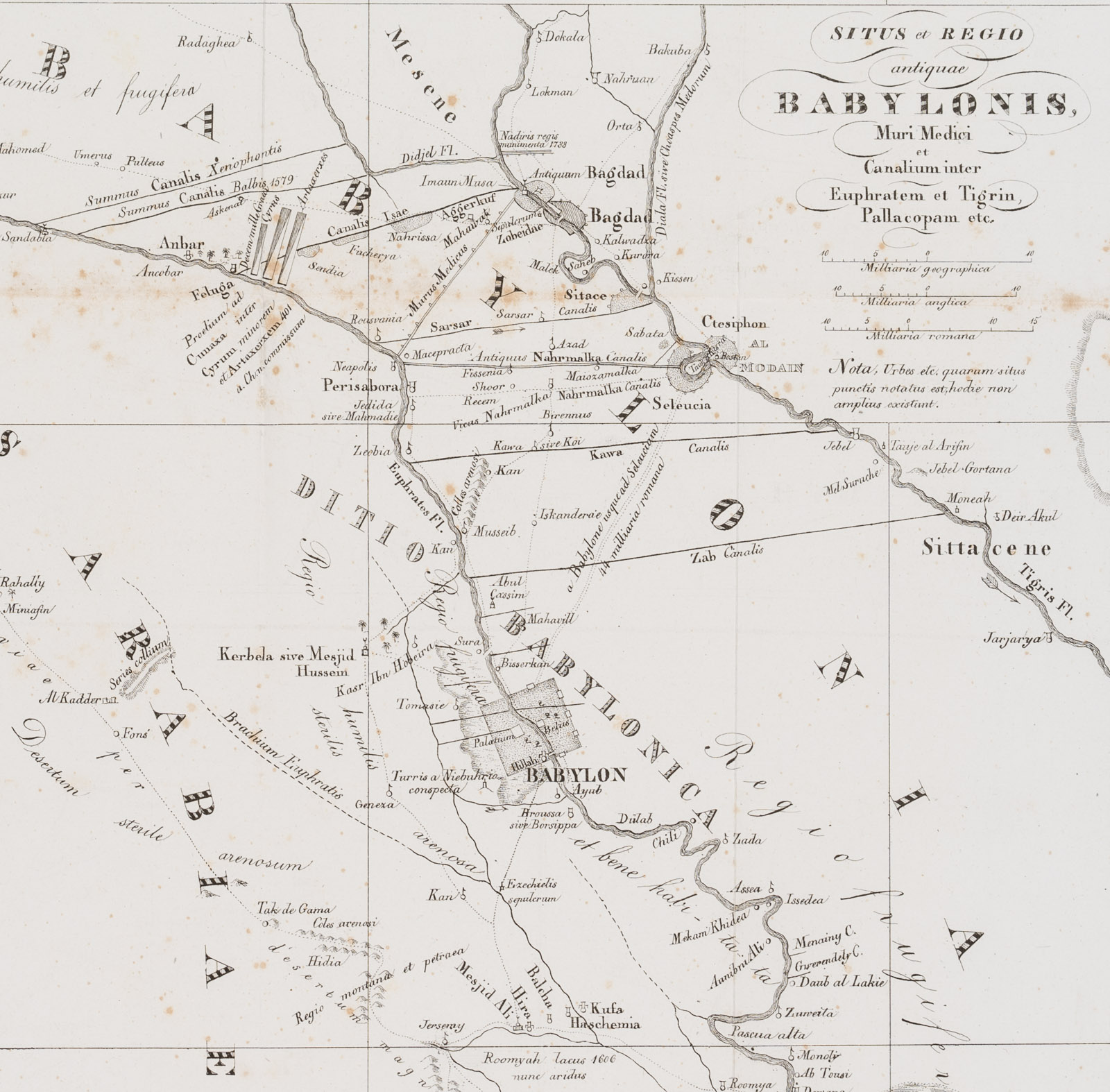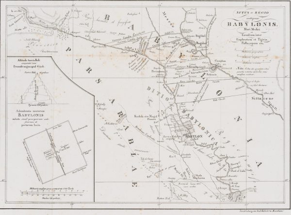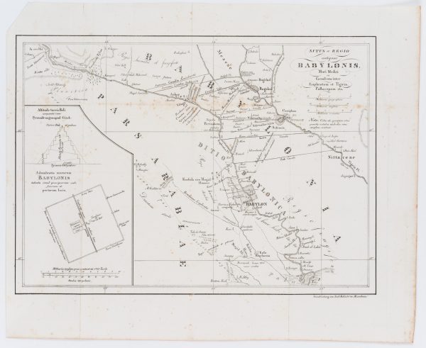 - Bezeichnung: Rechts oben beschriftet mit “Situs et Regio antiquae Babylonis, Muri Medici et Canalium inter Euphratem et Tigrin Palla copam etc.”. Rechts unterhalb der Graphik signiert mit “Steindruck von Rud. Schlicht in Mannheim”.