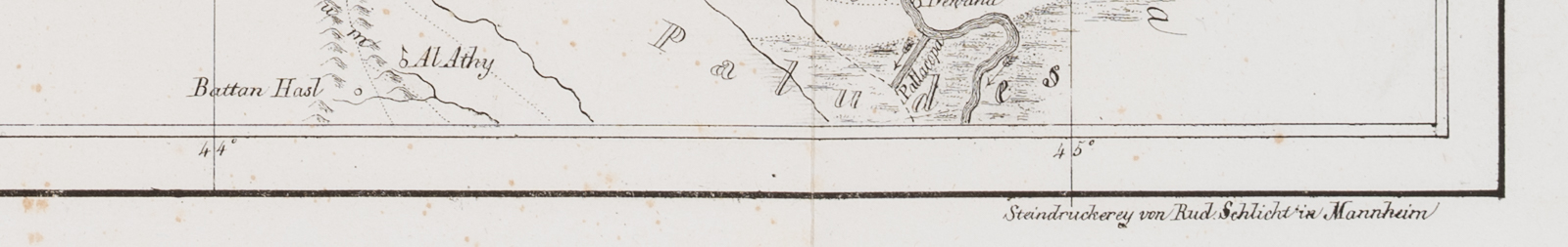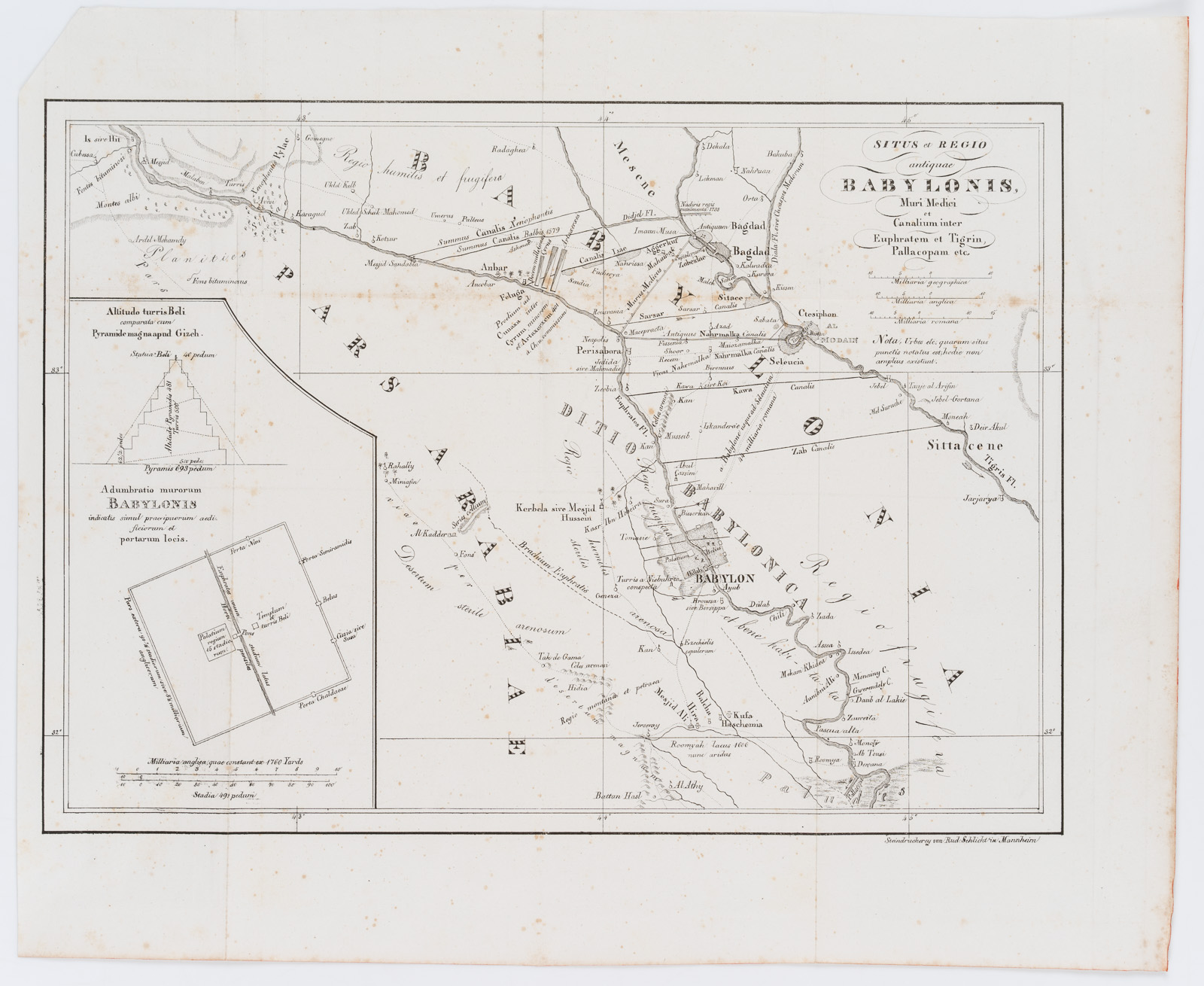 - Inscription: Inscribed at upper right with “Situs et Regio antiquae Babylonis, Muri Medici et Canalium inter Euphratem et Tigrin Palla copam etc.”. Signed on the right below the print “Steindruck von Rud. Schlicht in Mannheim”.