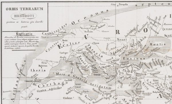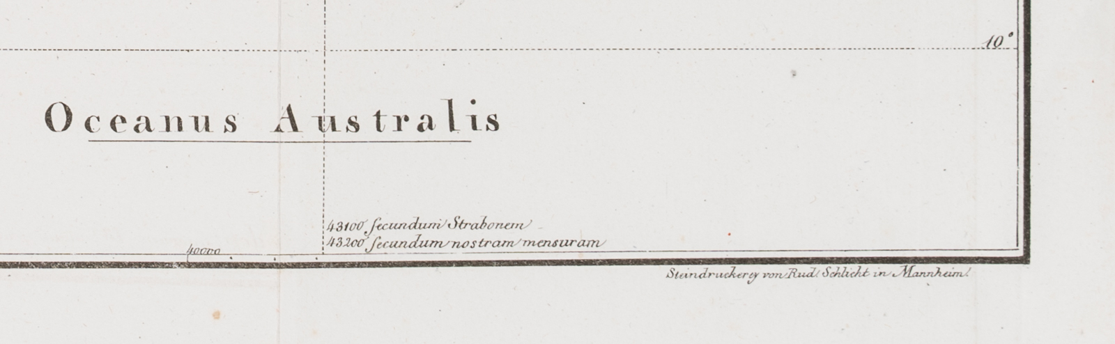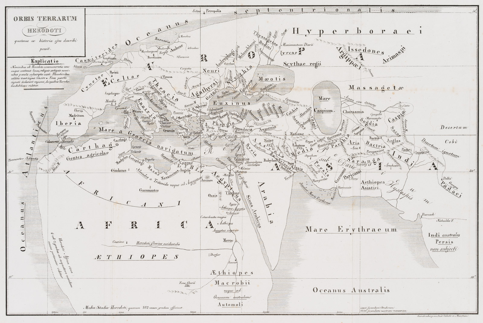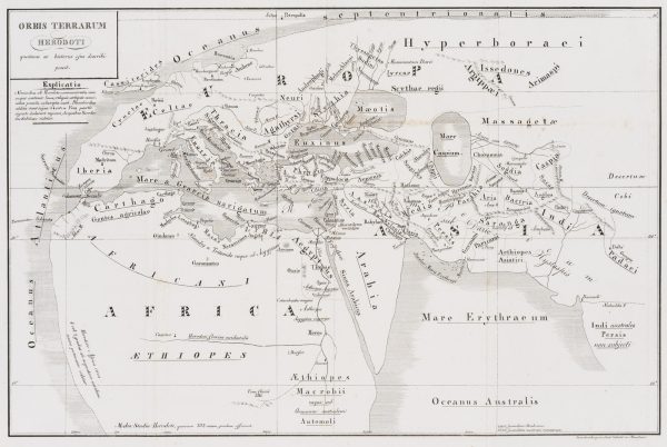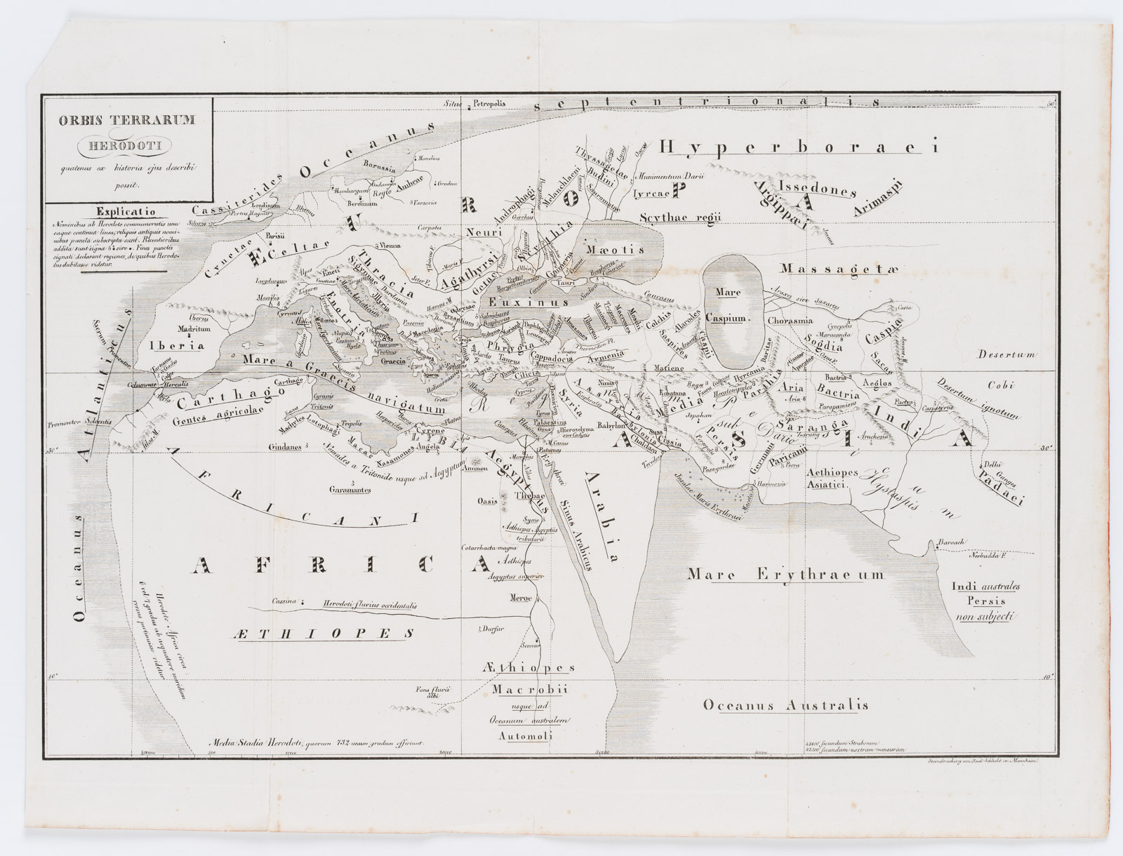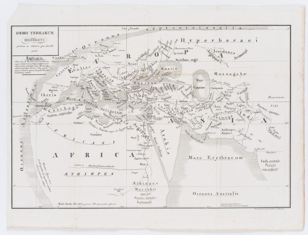 - Inscription: Inscribed “Orbis Terrarum Herodoti” at upper left. Signed on the right below the print “Steindruck von Rud. Schlicht in Mannheim”.