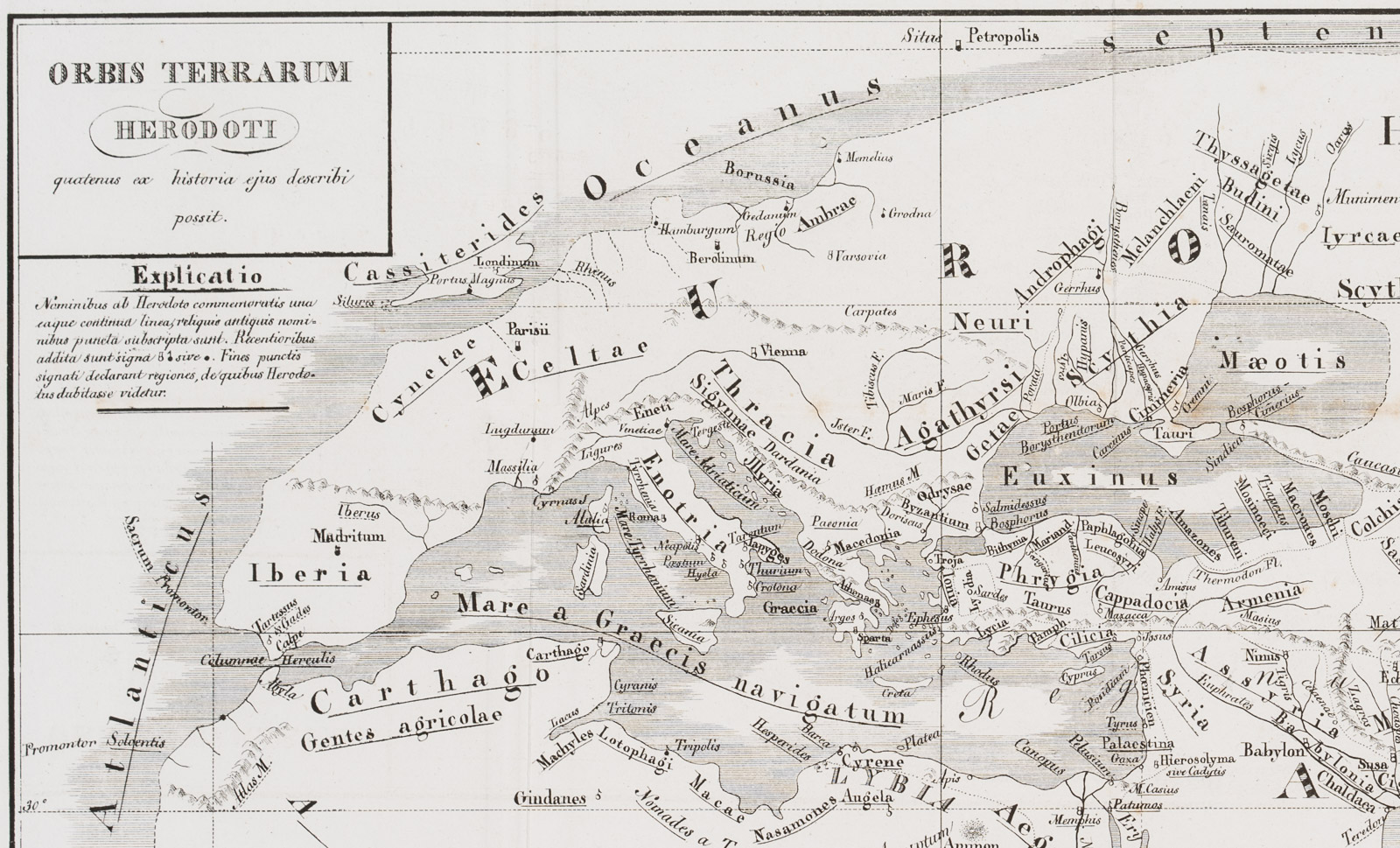 Rudolf Schlicht (19th century), Map of Europe, North Africa and West Asia ‘Orbis Terrarium Herodoti’, inscribed in Latin, 19th century, Lithography with pen