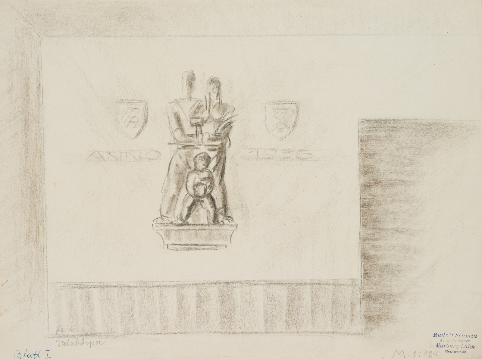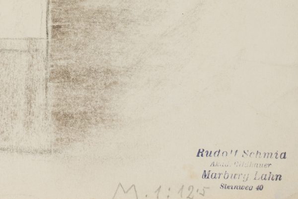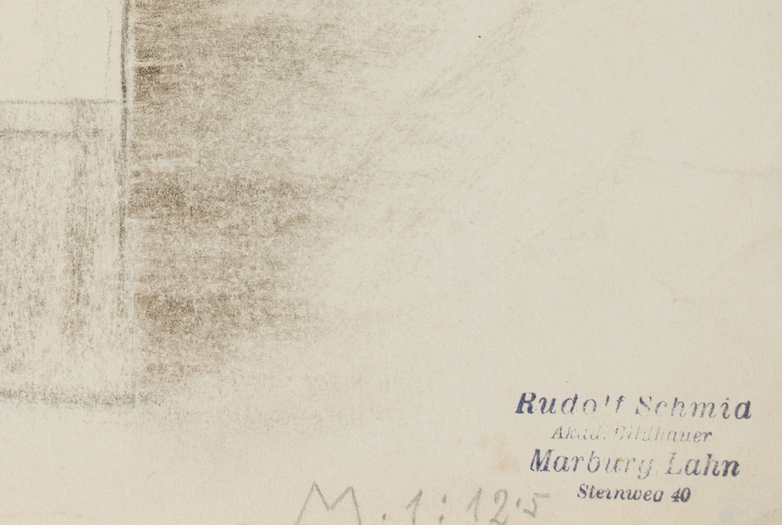 - Inscription: Stamped lower right: “Rudolf Schmid / Akad. Bildhauer / Marburg Lahn / Steinweg 10” and scale: “M. 1:12,5”, inscribed lower left “Blatt 1” and with material: “Holzkörper”.