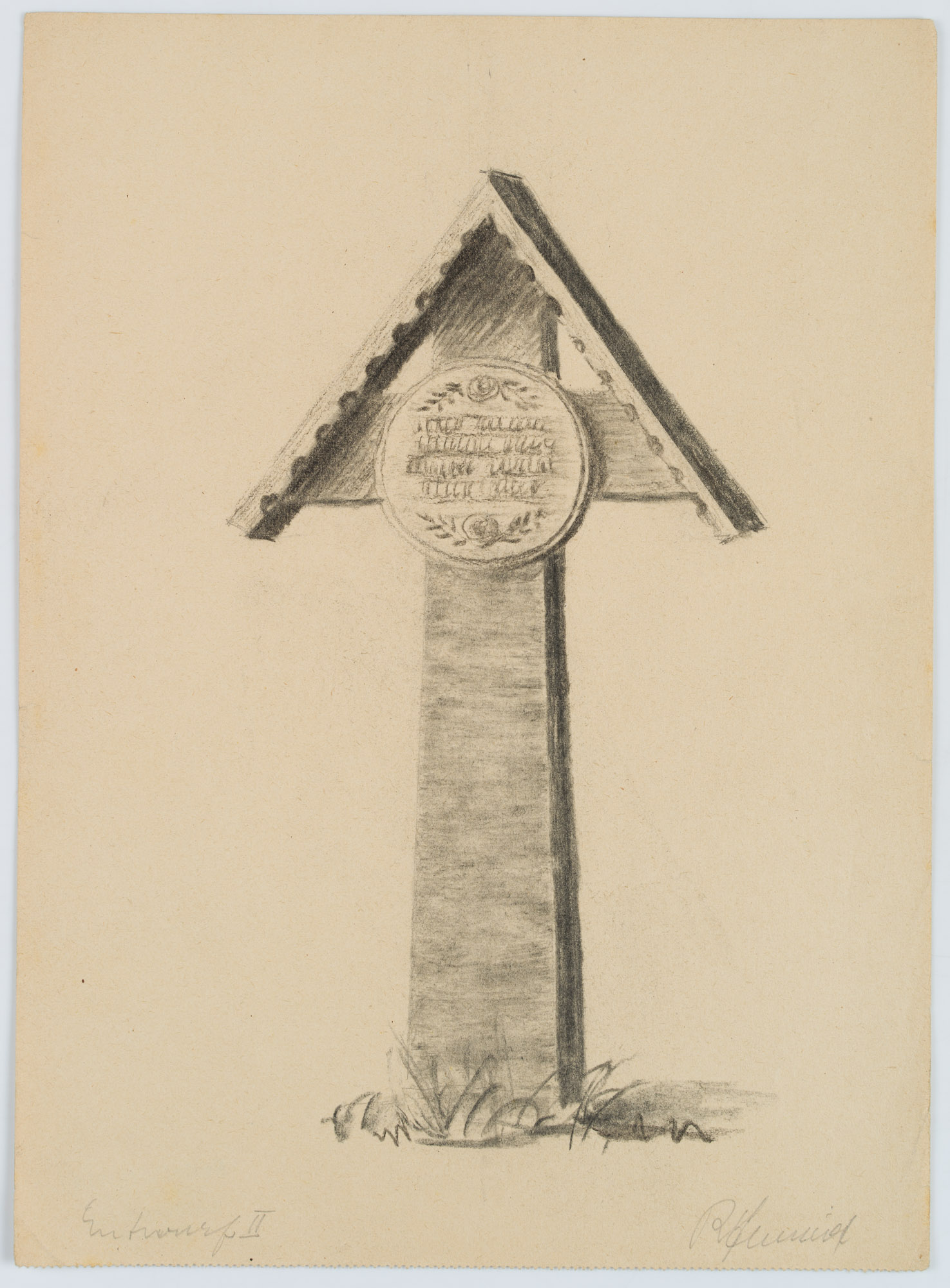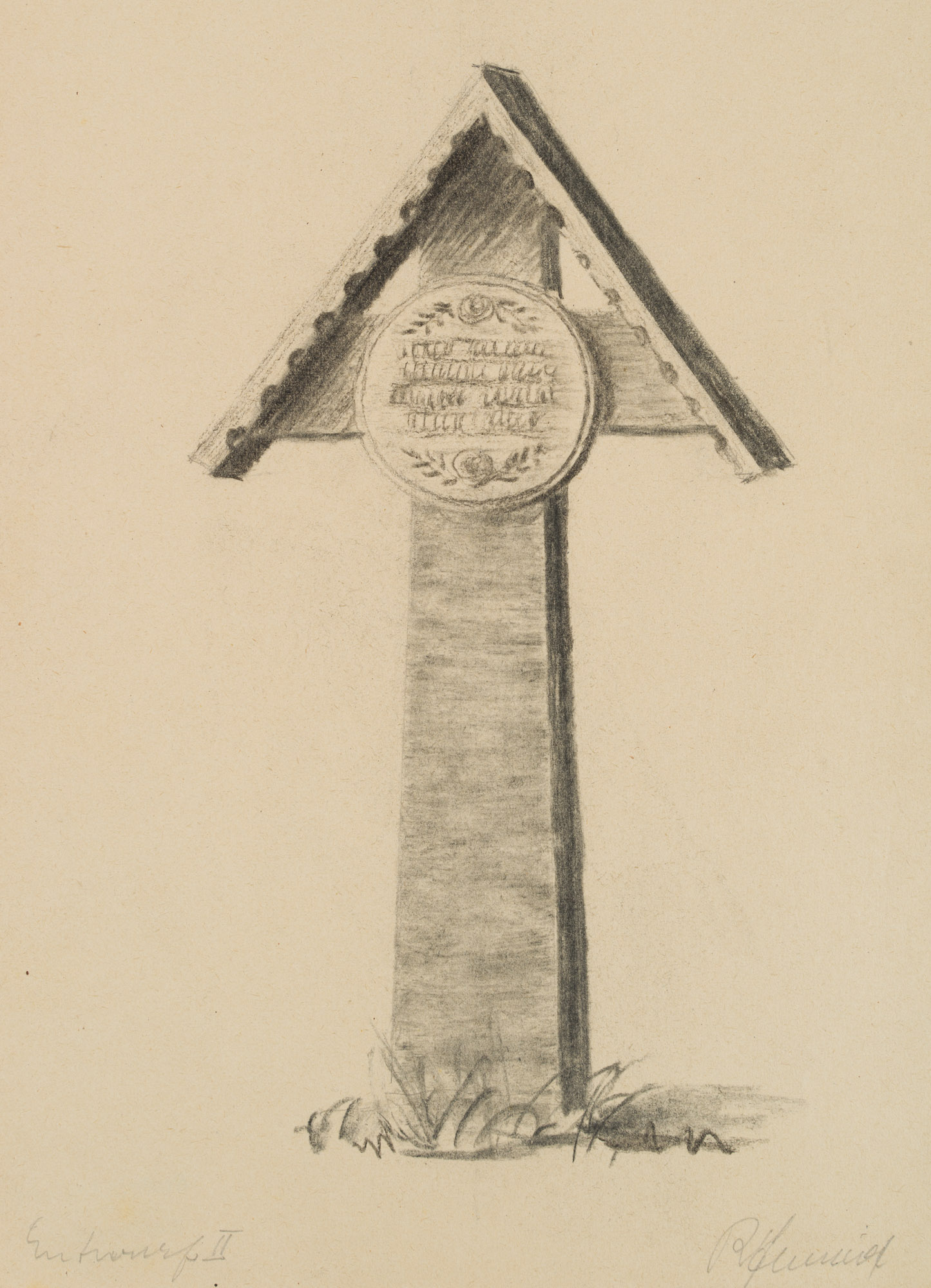 - Inscription: Signed “Rschmid” lower right, inscribed “Entwurf II” on the left; stamp on verso: “Rudolf Schmid / Akad. Bildhauer / Marburg Lahn / Steinweg 10”.