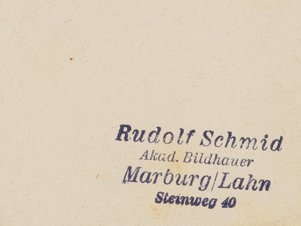 - Bezeichnung: Unten rechts signiert “Rschmid”, links bezeichnet “Entwurf II”; verso mit Stempel: “Rudolf Schmid / Akad. Bildhauer / Marburg Lahn / Steinweg 10”.