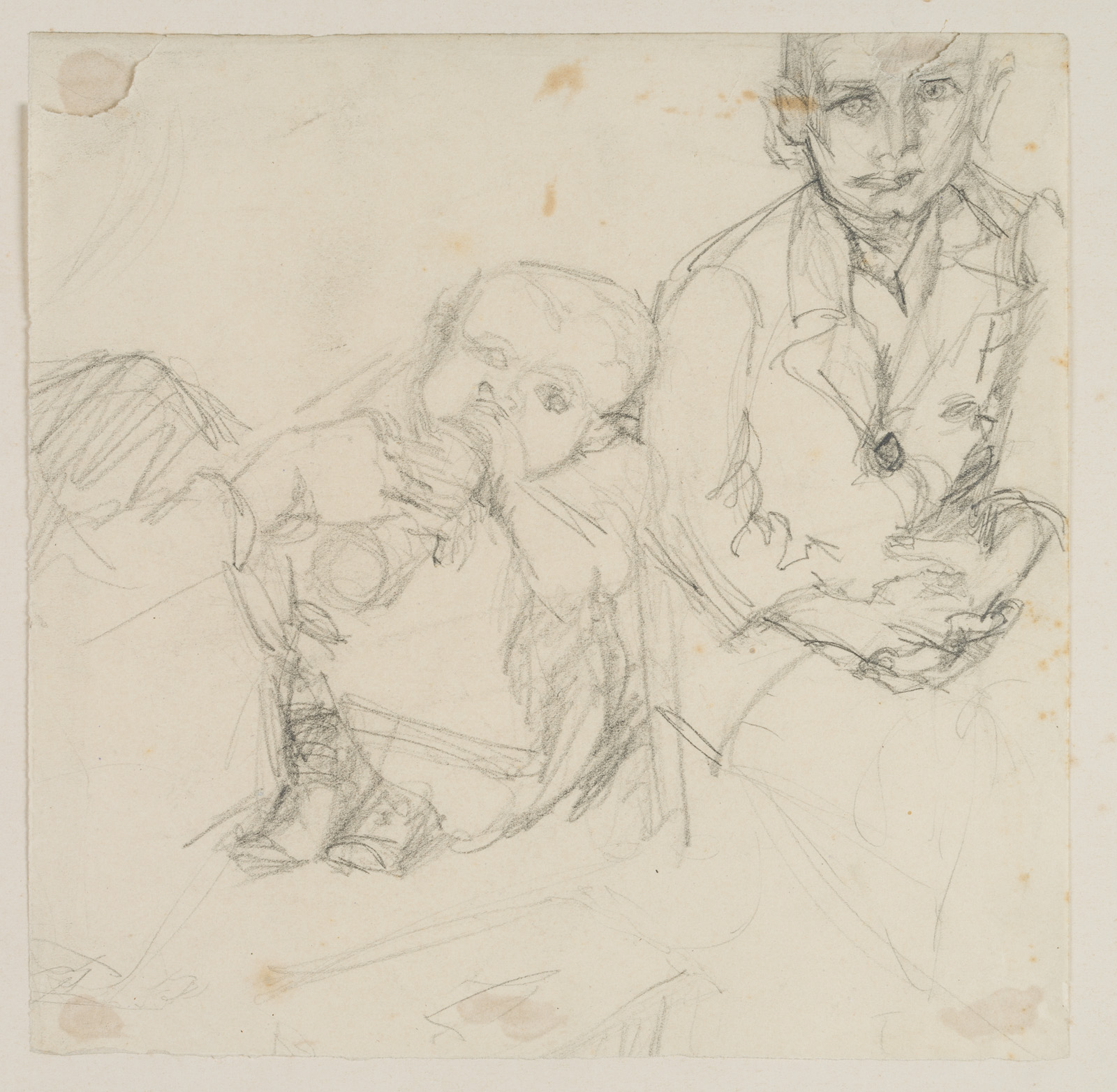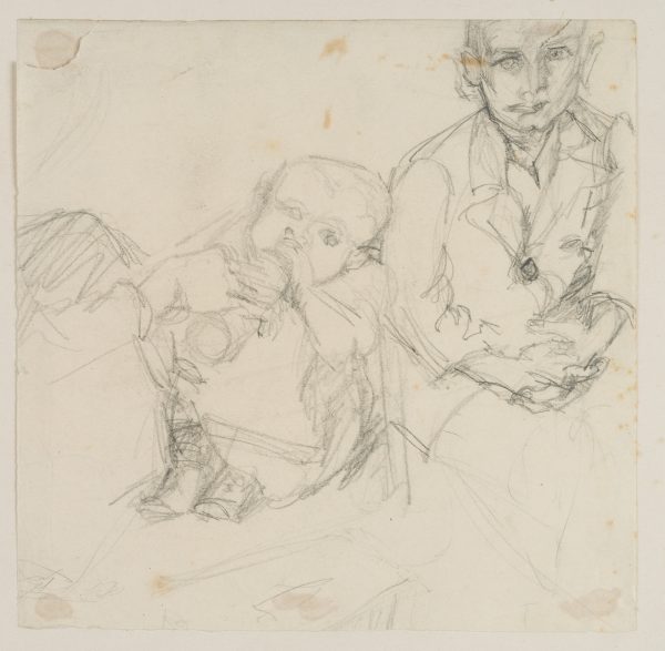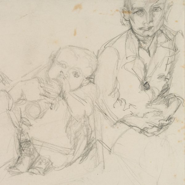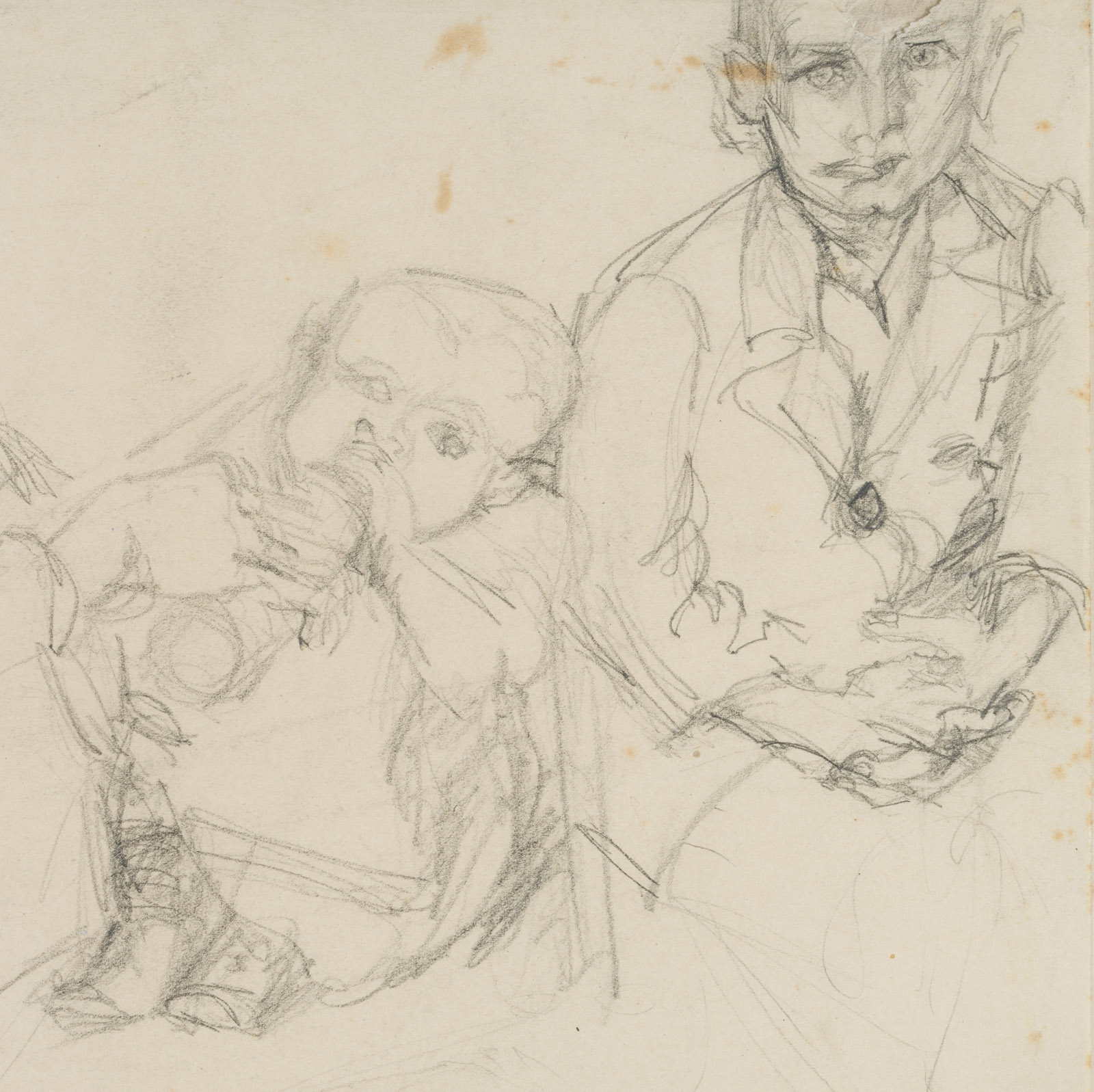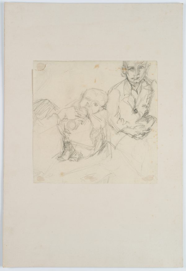 Rudolf Schmid (1896 Dolní Rychnov near Falknov – 1971 Marburg on the Lahn), Brother and sister, small child with bottle, c. 1950, Pencil