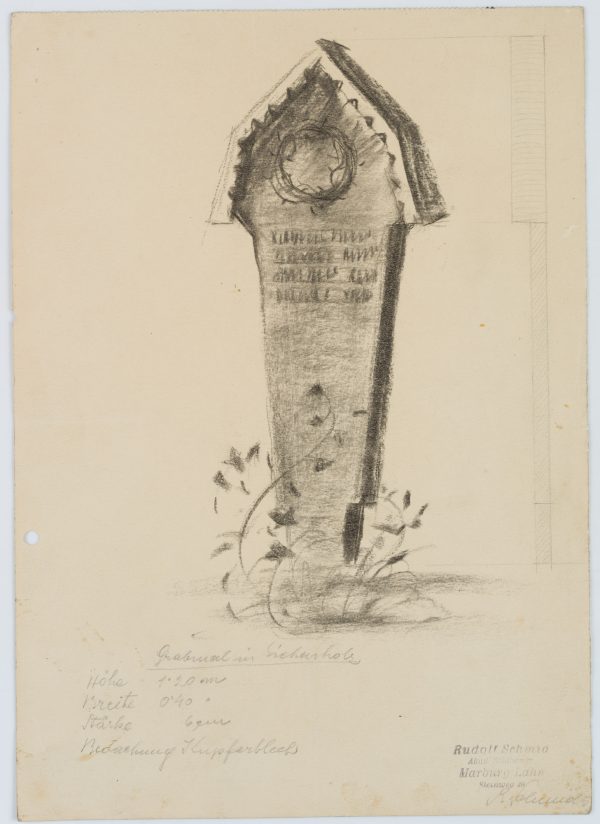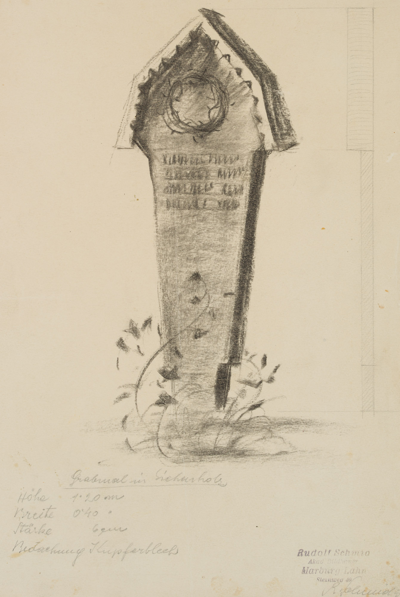Singnated “R. Schmid” at the bottom right, inscribed in lead “Grabmal in Eichenholz Höhe 1,20 m Breite 0,40 m Stärke 6 cm, Bedachung Kupferblech”, inscribed on the verso “Friedhofsverwaltung”. - Keywords: 20th century, Figurative, Architecture, Germany,