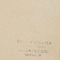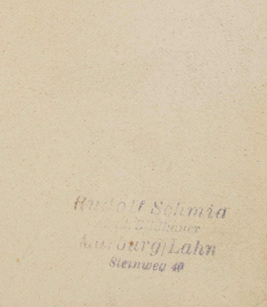 - Inscription: Stamped lower right on the backing: “Rudolf Schmid / Akad. Bildhauer / Marburg/Lahn / Steinweg 10”.