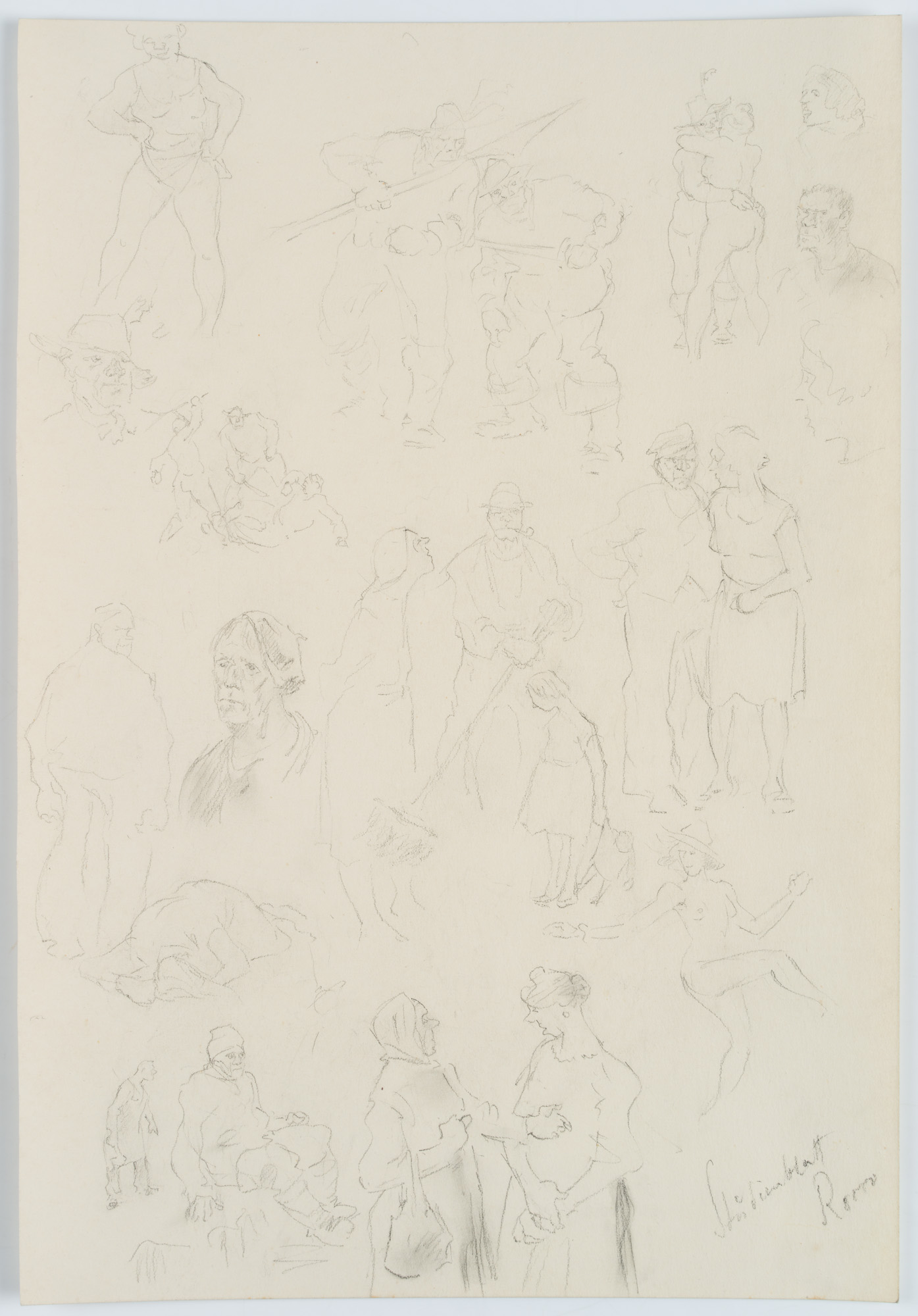 - Beschreibung: Rustikale Straßenszenen finden sich hier ebenso, wie ins Gespräch vertiefte Frauen, ein Straßenfeger mit Pfeife gesellt sich zu einem Gaukler und einem eng umschlungen tanzenden Paar. Sie alle hat der Künstler in Rom gesehen und auf seinem Studienblatt festgehalten.