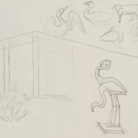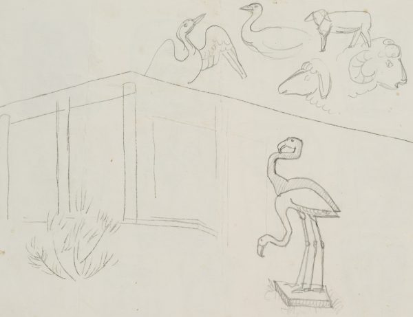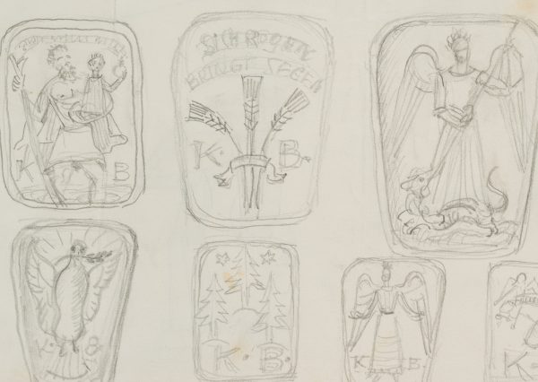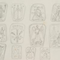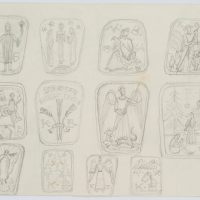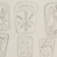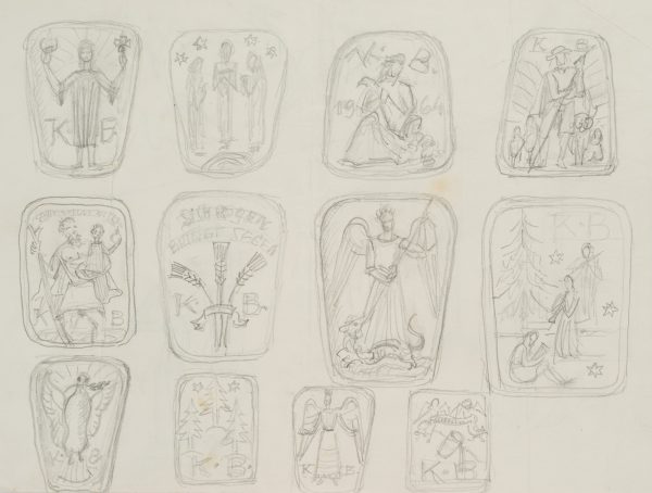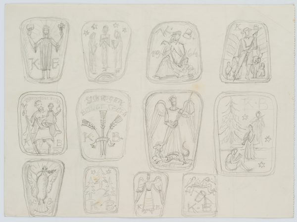 - Bezeichnung: Oben in der dritten Darstellung nummeriert: “1964”. Drei Reihen mit jeweils vier Darstellungen aus dem Christentum: “Sich regen bringt Segen” mit Ähren, Erzengel Michael erschlägt den Drachen und die Friedenstaube mit dem Ölzweig. Verso mit Tierstudien: Flamingo, Schaf und Schwan.
