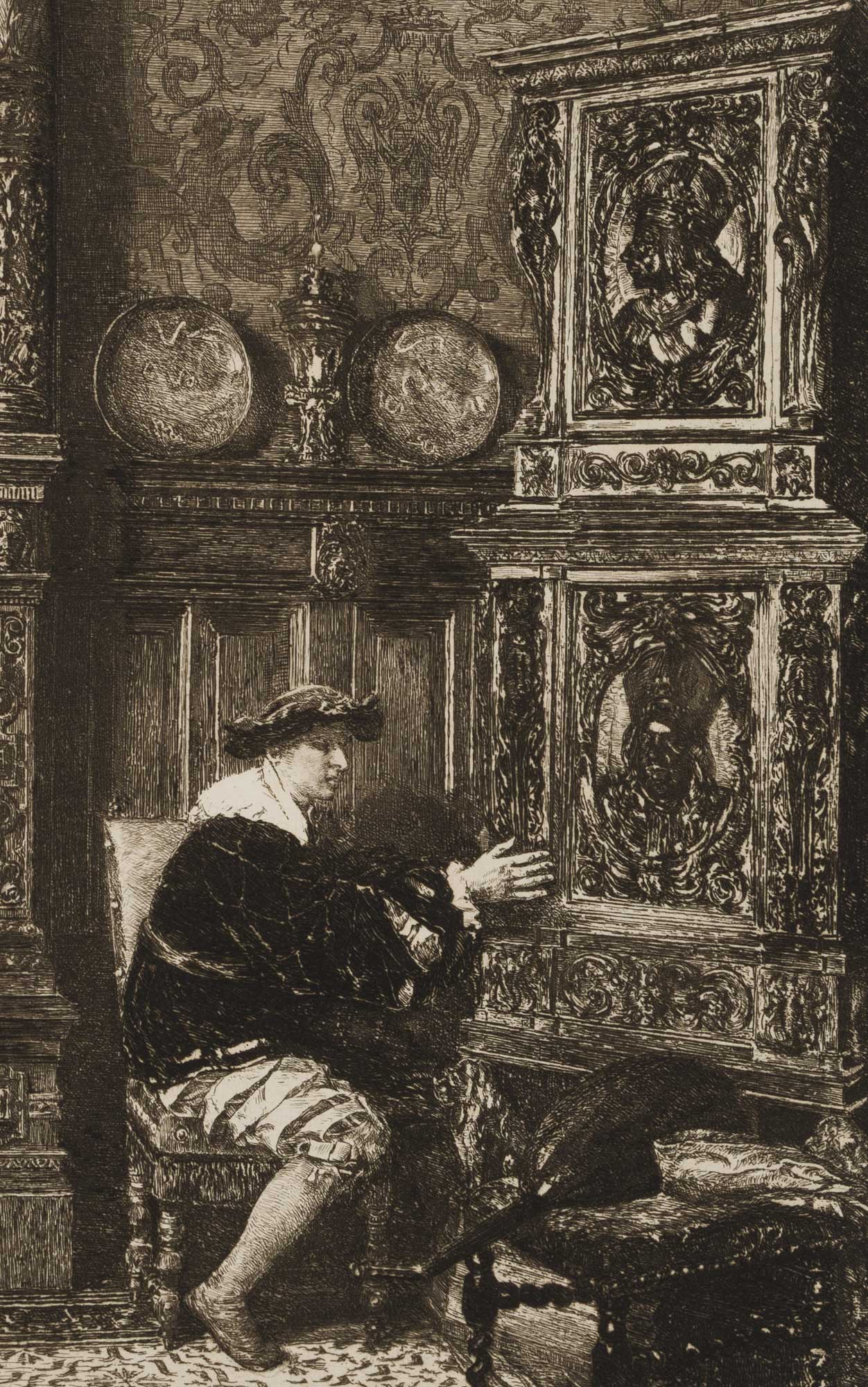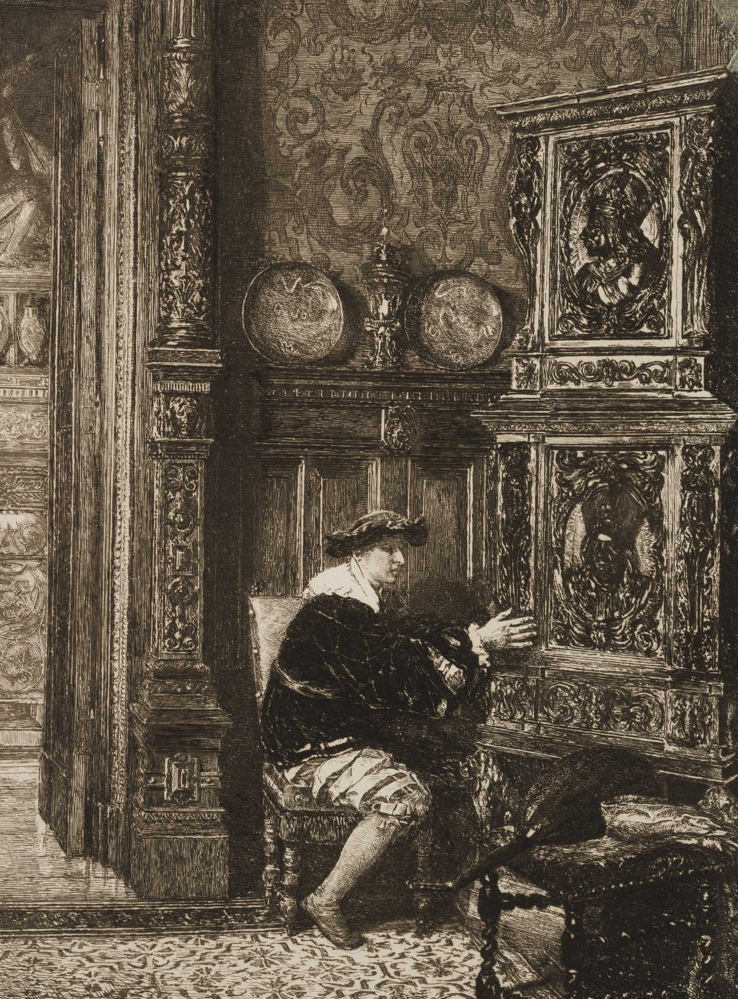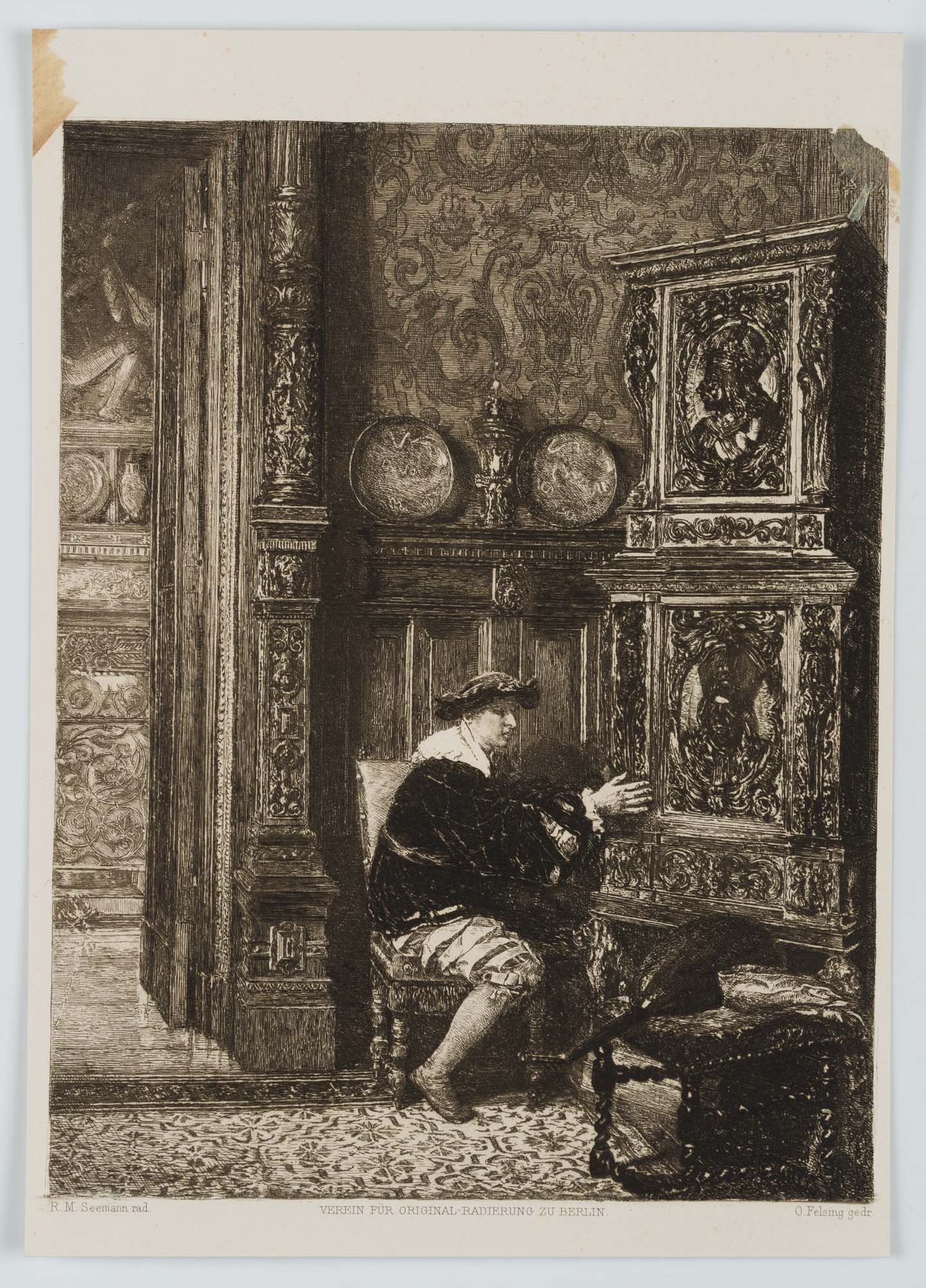 R. Max Seemann (1838 Gumbinnen, heute Gussew – 1907 Berlin), Historistische Interieurszene mit Mandolinenspieler am Schlosskamin, 19. Jahrhundert, Radierung