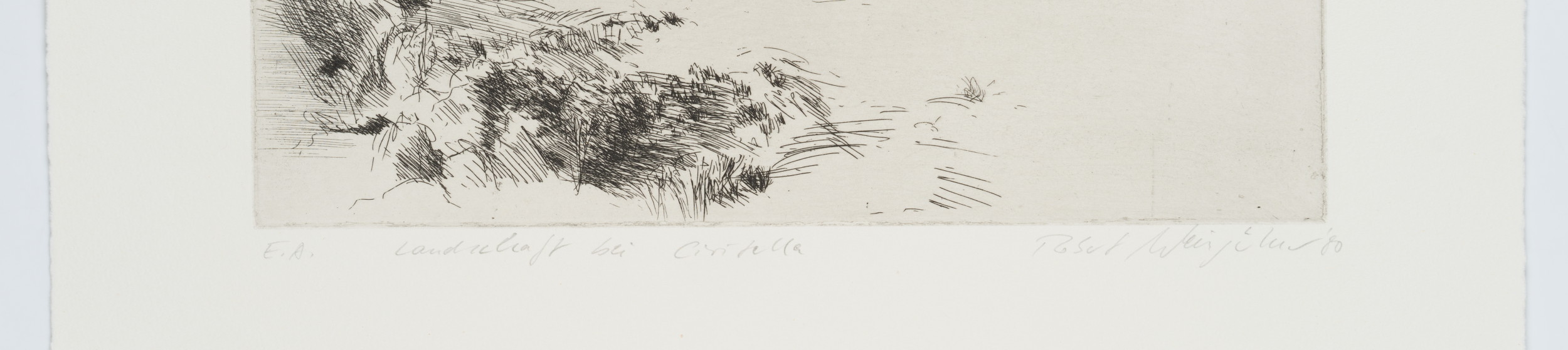 - Inscription: Lower right signed: “Robert Weingärtner ’80”. Lower middle inscribed by the artist’s hand: “E.A. Landschaft bei Civitella”.