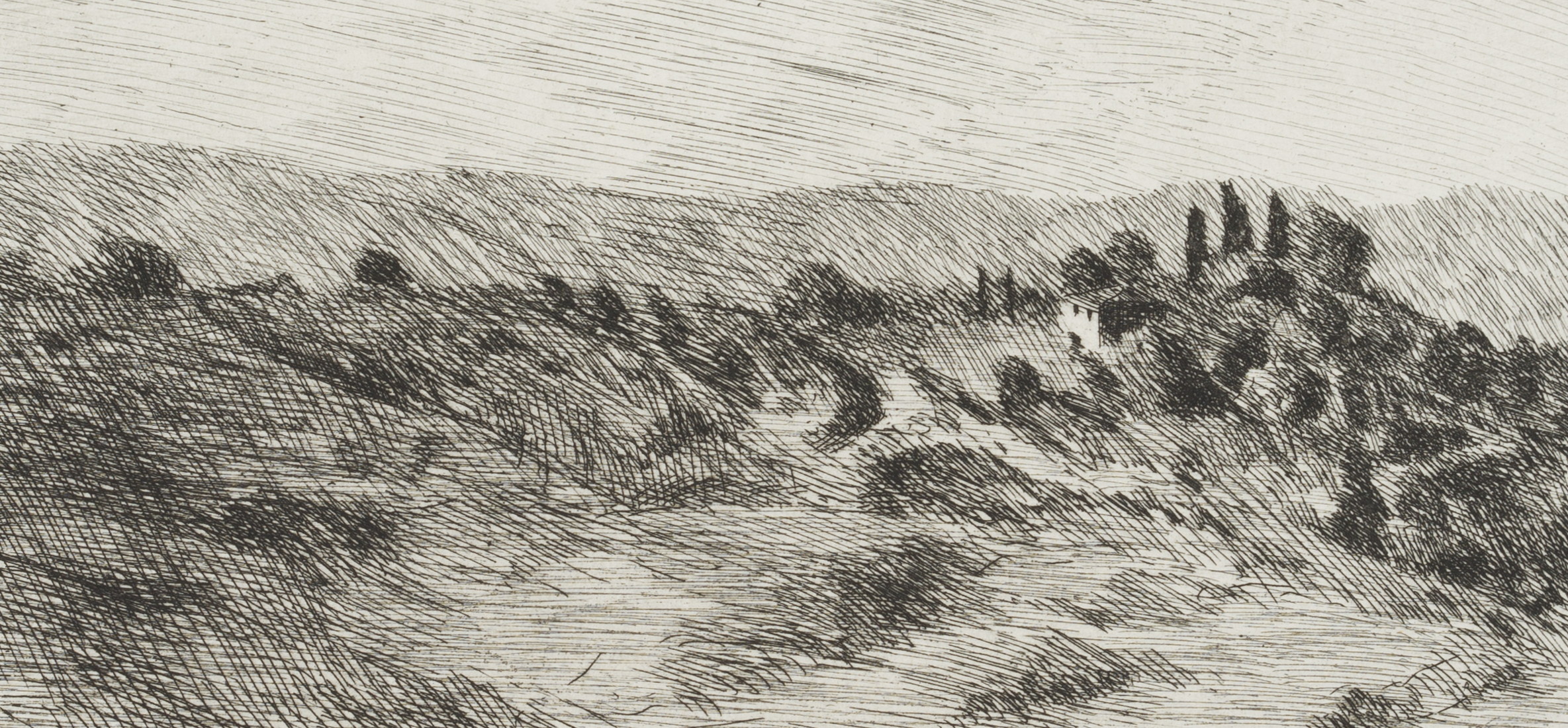 Robert Weingärtner (born 1955 Würzburg), Mediterranean landscape with cottages in the distance, 1980, Etching