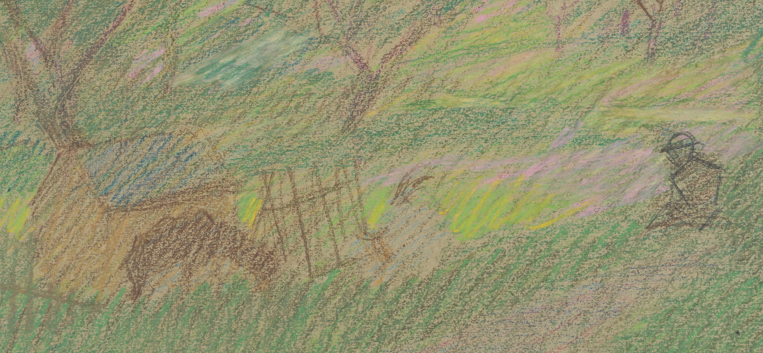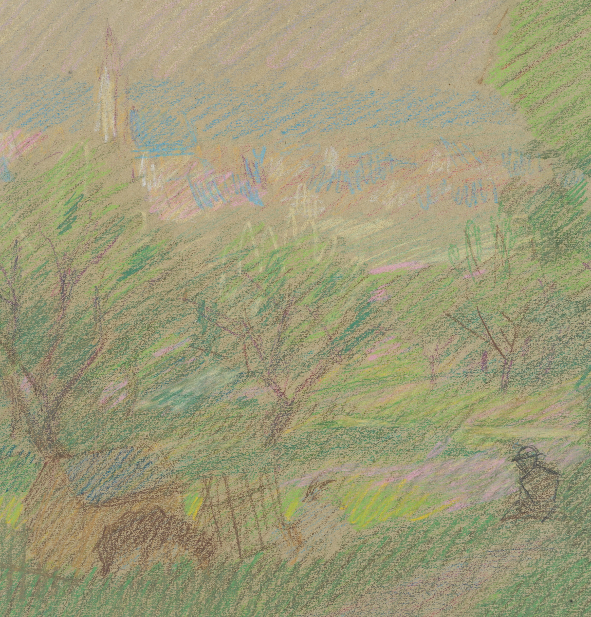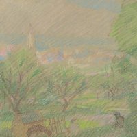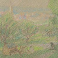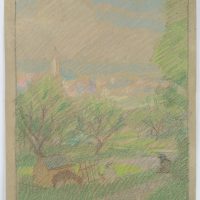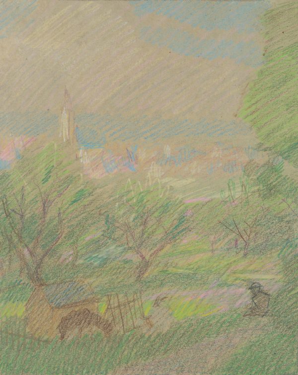 Rolf Winter (1881 Kronberg – 1968 ibid.), View of meadows and fields with town and church tower in the distance, , Colored pencil