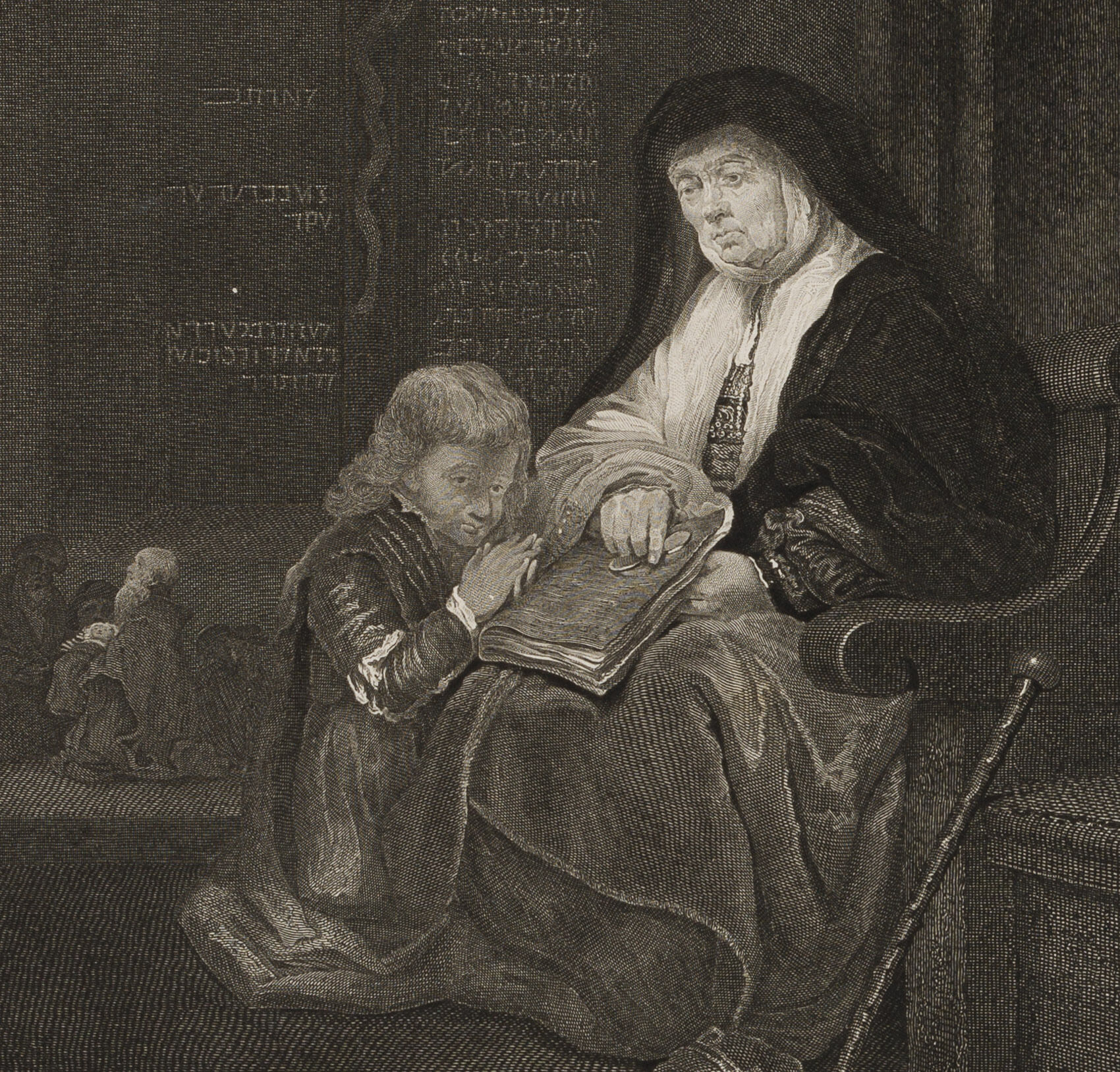 - Beschreibung: Samuels Mutter Hanna rechts in einer Kirche sitzend, eine Brille und ein Buch auf dem Schoß haltend, Samuel als kleiner Junge links an sie gelehnt, rechts unten ein Rohrstock.