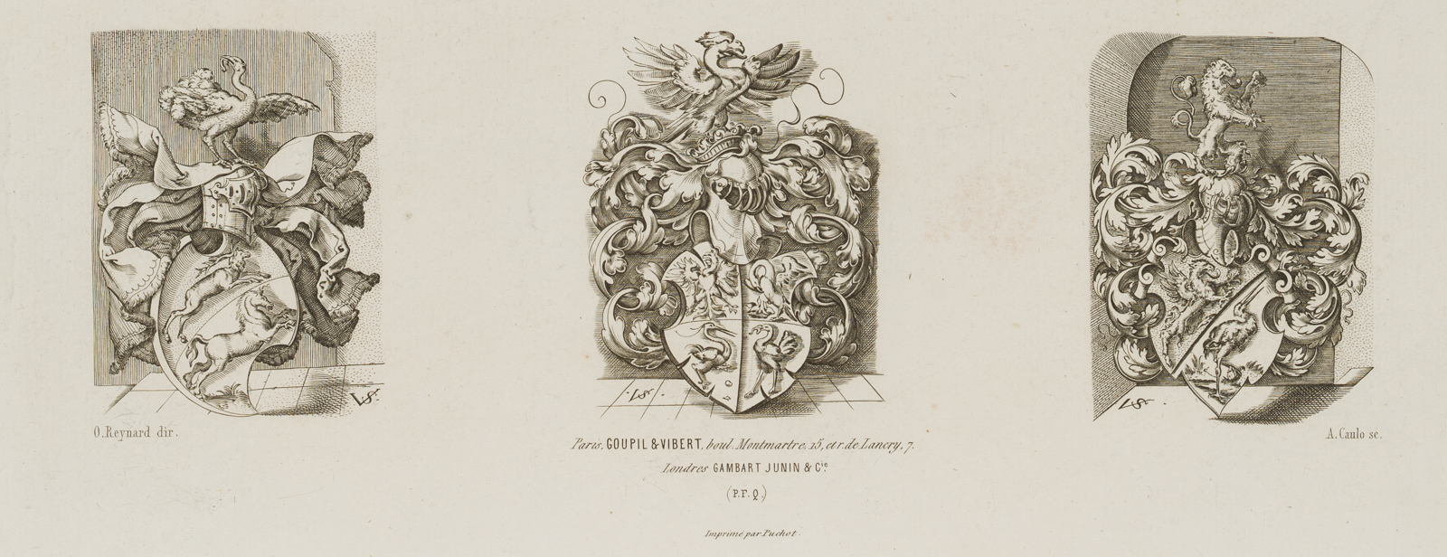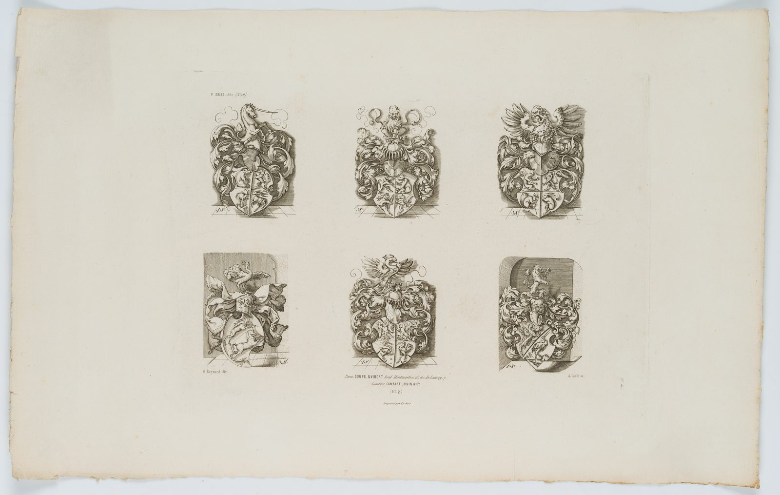 Ovide Reynard (born 1817 Auvergne) after Antonin Caulo (19th century), Patterns Variations of heraldic motifs, heraldry, after Virgilius SOLIS (1514 Nuremberg – 1562 ibid), from 1550, sheet no 16, plate 40, 19th century, Reproduction