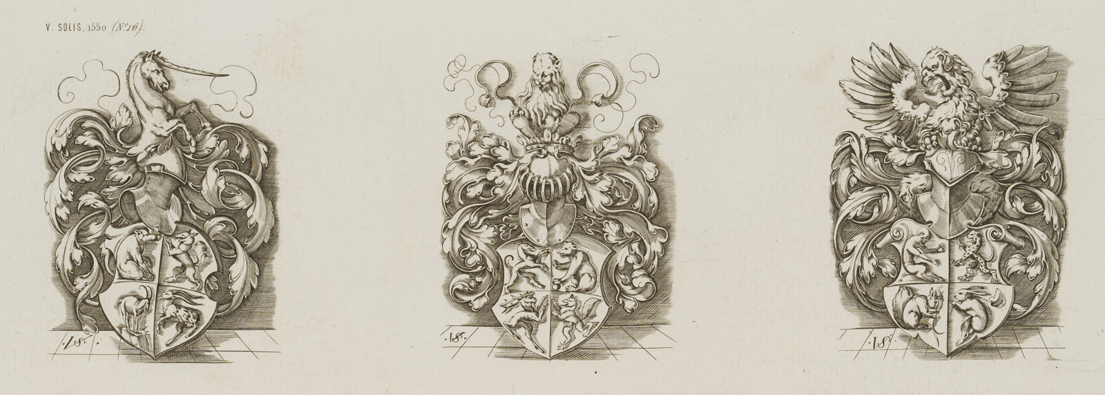 Ovide Reynard (*1817 Auvergne) nach Antonin Caulo (19. Jahrhundert), Mustervorlagen. Variationen von Wappenmotiven, Heraldik, nach Virgilius SOLIS (1514 Nürnberg – 1562 ebd.), von 1550, Blatt Nr. 16, Platte 40, 19. Jahrhundert, Reproduktion