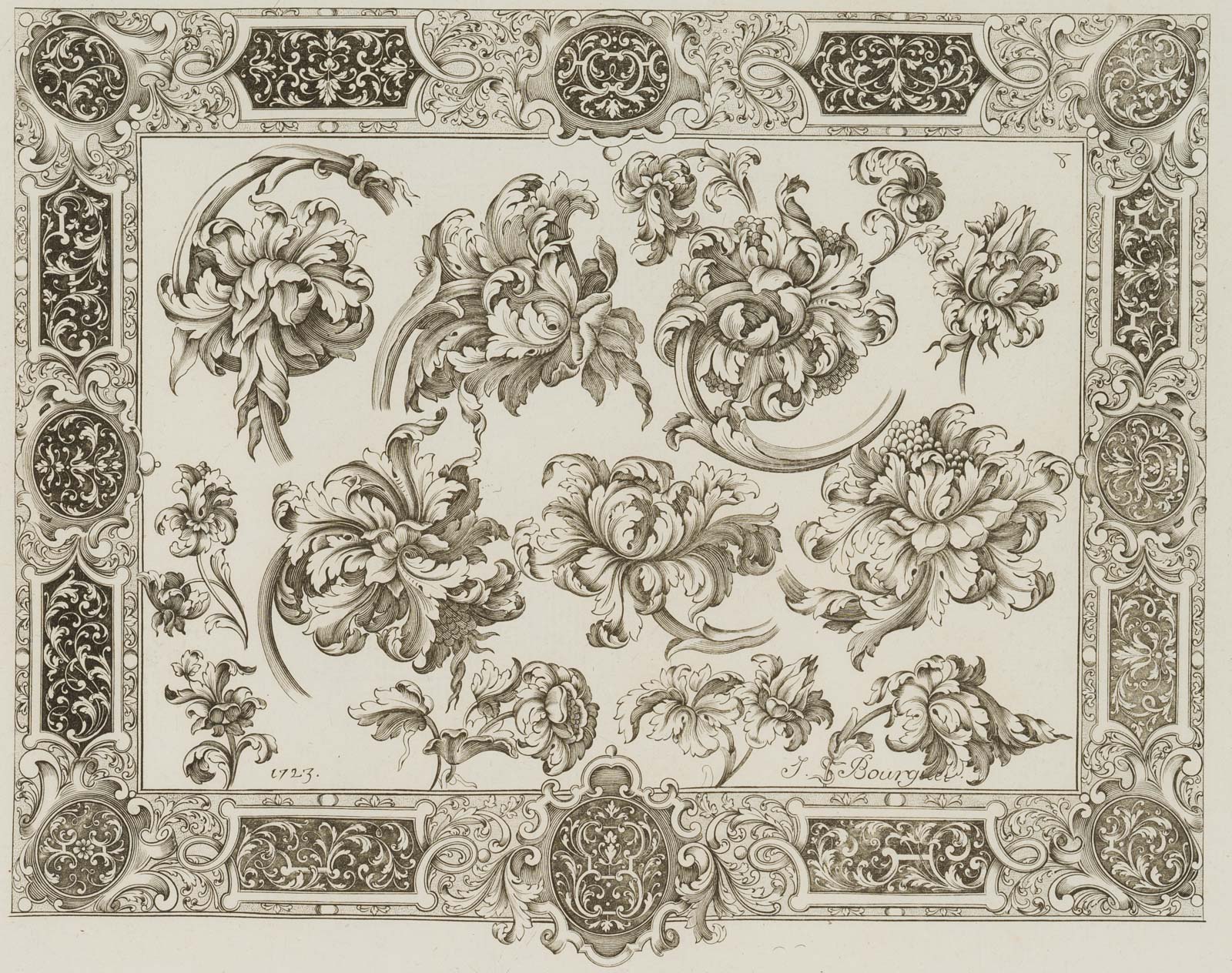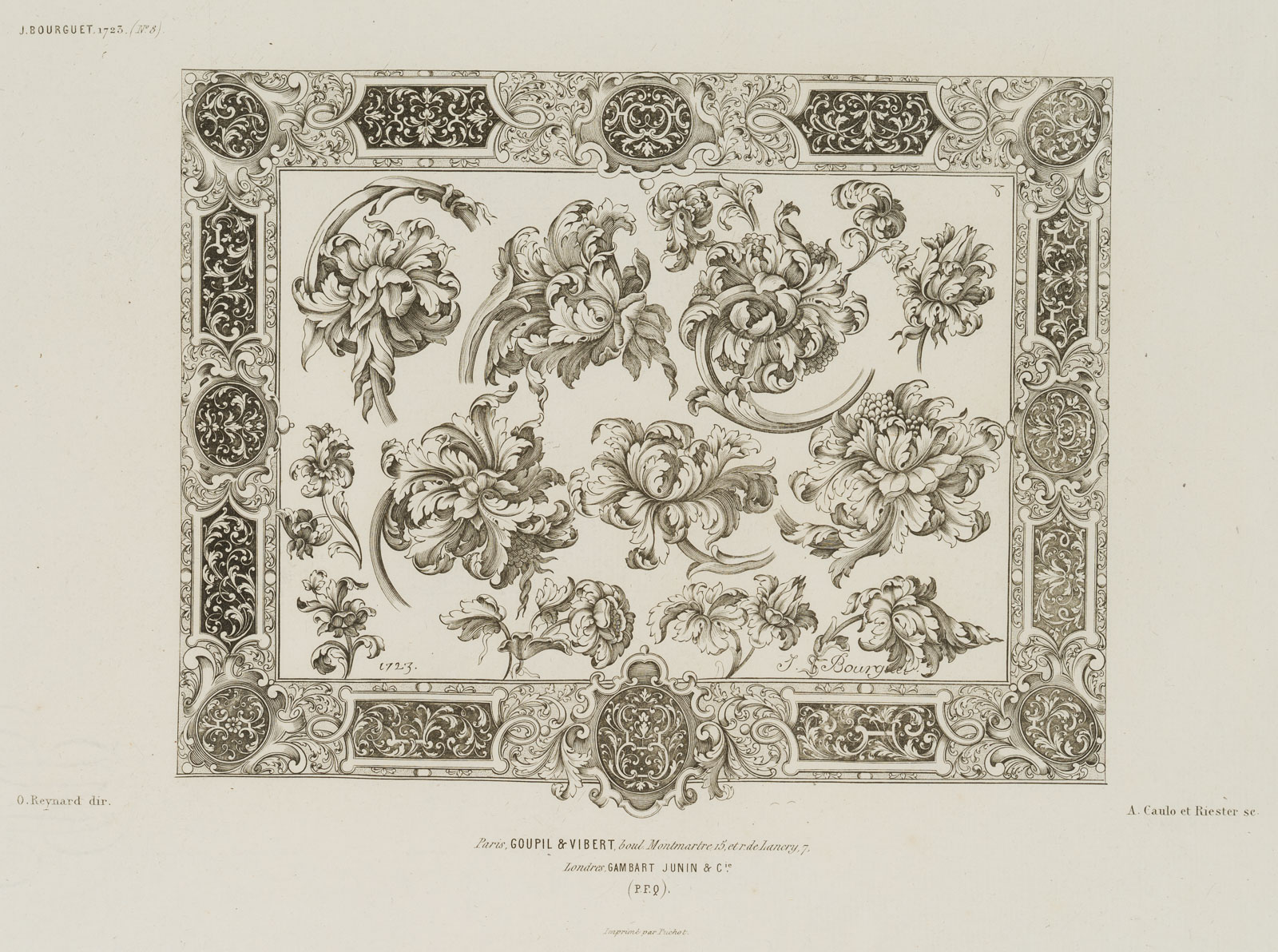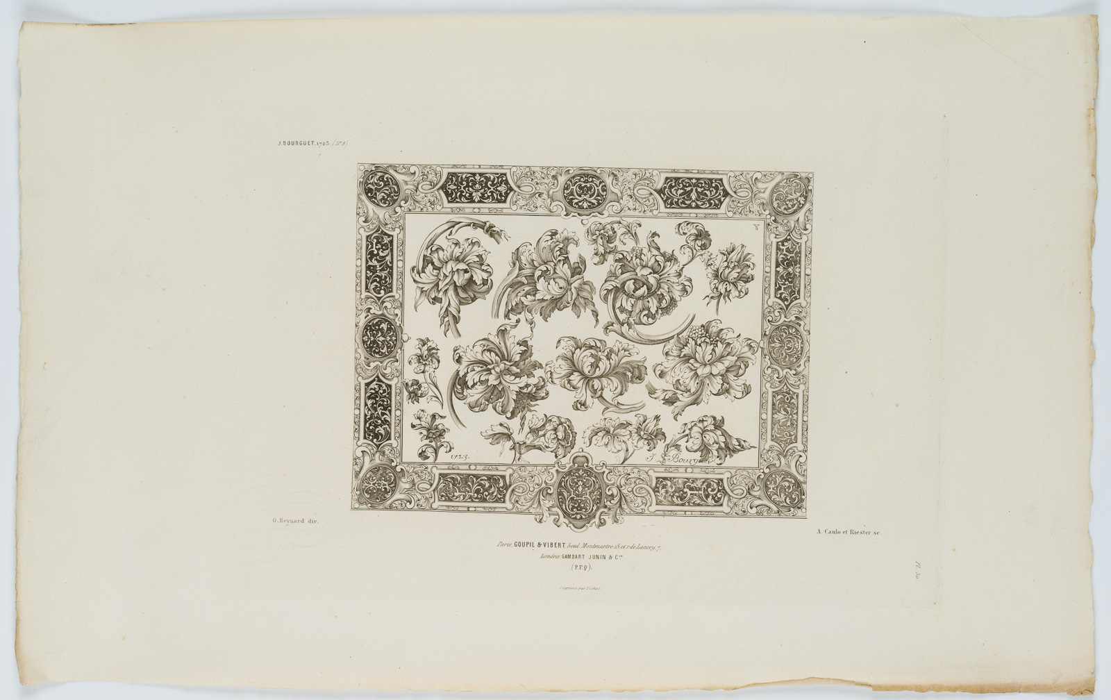 Ovide Reynard (born 1817 Auvergne) after Antonin Caulo (19th century), Three patterns for gold- and silversmithing, after the series by J BOURGUET from 1725, sheet no 8, 19th century, Reproduction