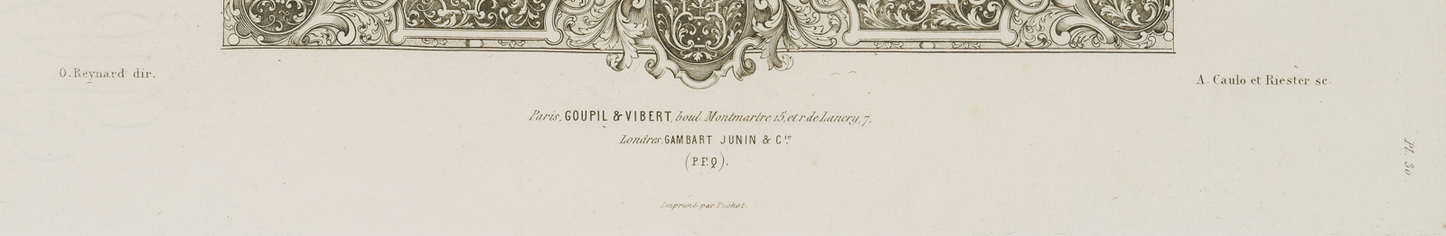 - Inscription: Signed “O. Reynard dir.” below the depictions on the left and “Riester sc.” on the right. Below with details of the publisher: “Paris Goupil & Vibert”. With a watermark of fine curved lines.