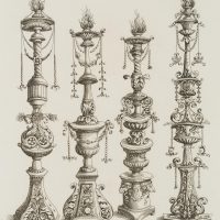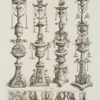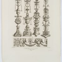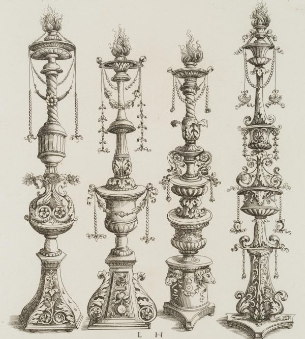 Ovide Reynard (*1817 Auvergne) nach Charles Ernest Clerget (1812 – um 1870 ), Mustervorlage für vier Kandelaber, Armleuchter, nach Lambert HOPFER von 1527, Blatt Nr. 3, Platte 27, 19. Jahrhundert, Reproduktion