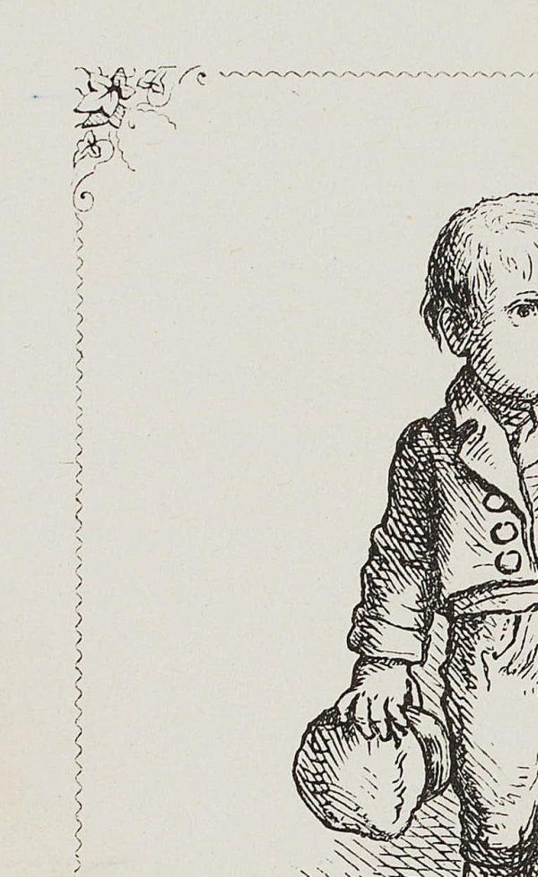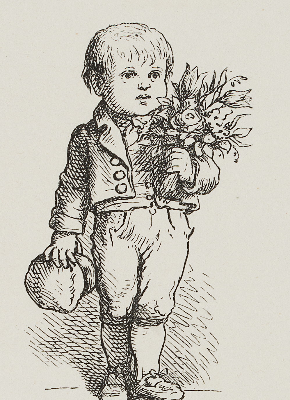 - Beschreibung: Knabe mit Blumenstrauß. Ursprüngliche Darstellung mit Engel für “Der Kinderengel”, später von Hugo Bürkner ohne Engel nachgezeichnet.