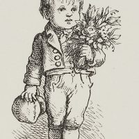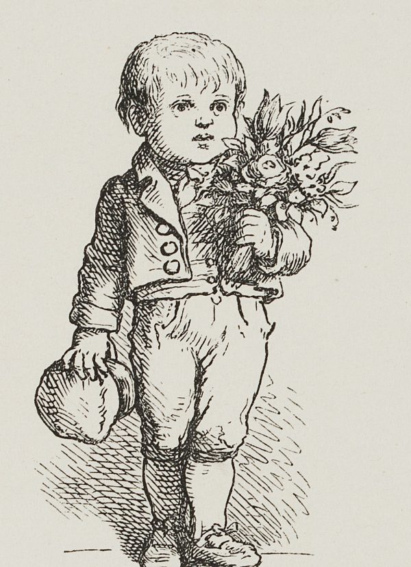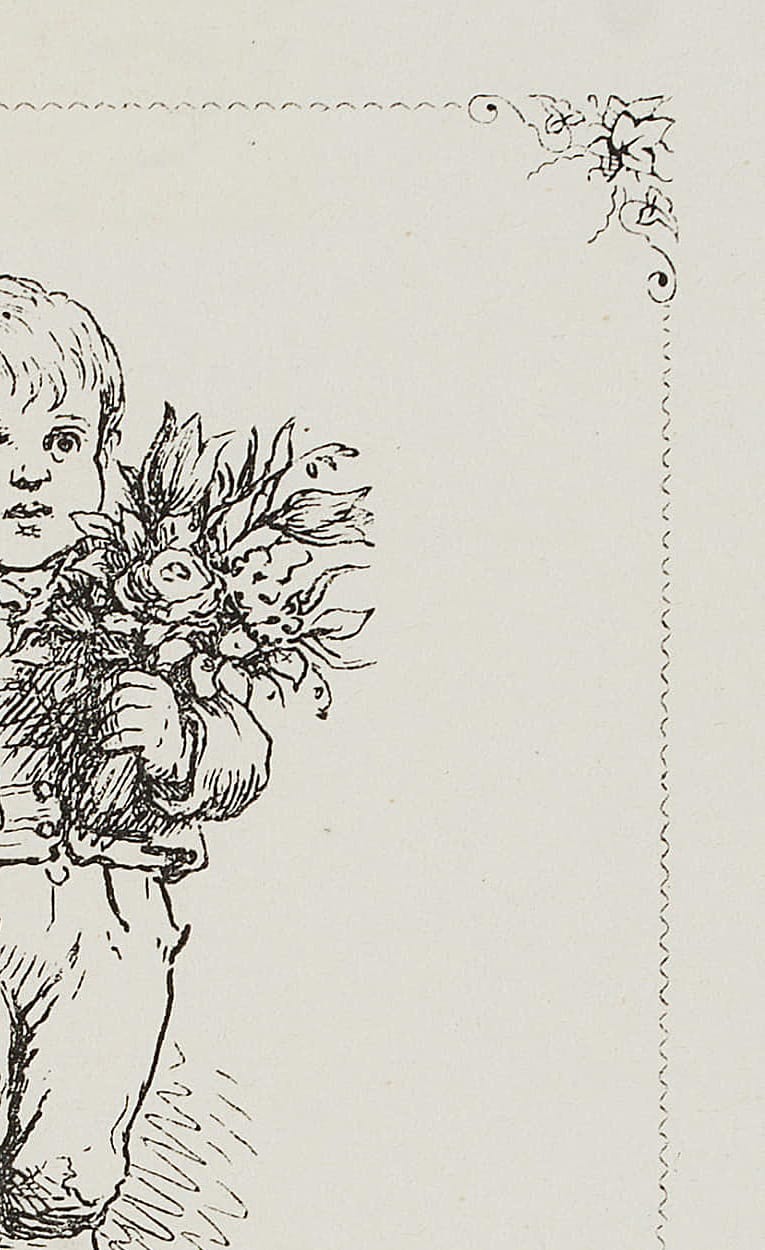 - Description: Boy with a bouquet of flowers. Original depiction with angel for “Der Kinderengel”, later redrawn by Hugo Bürkner without angel.
