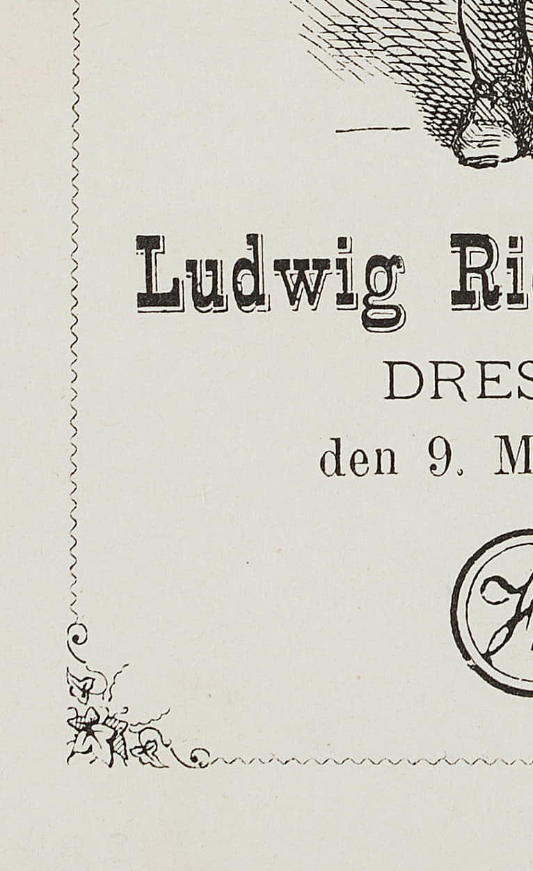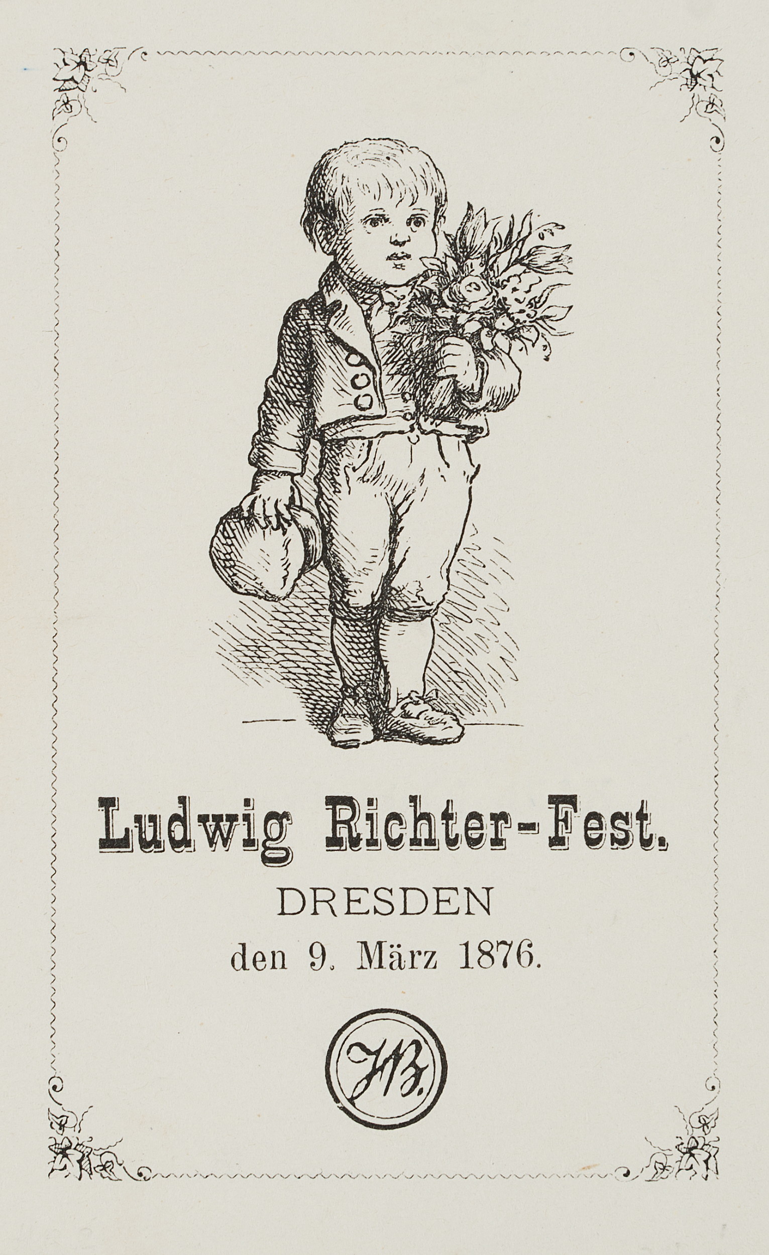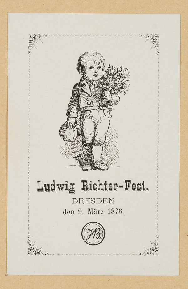 - Bezeichnung: Unten mittig monogrammiert (ligiert): “HB”. Unten im Druck bezeichnet: “Ludwig Richter-Fest. Dresden den 9. März 1876”.