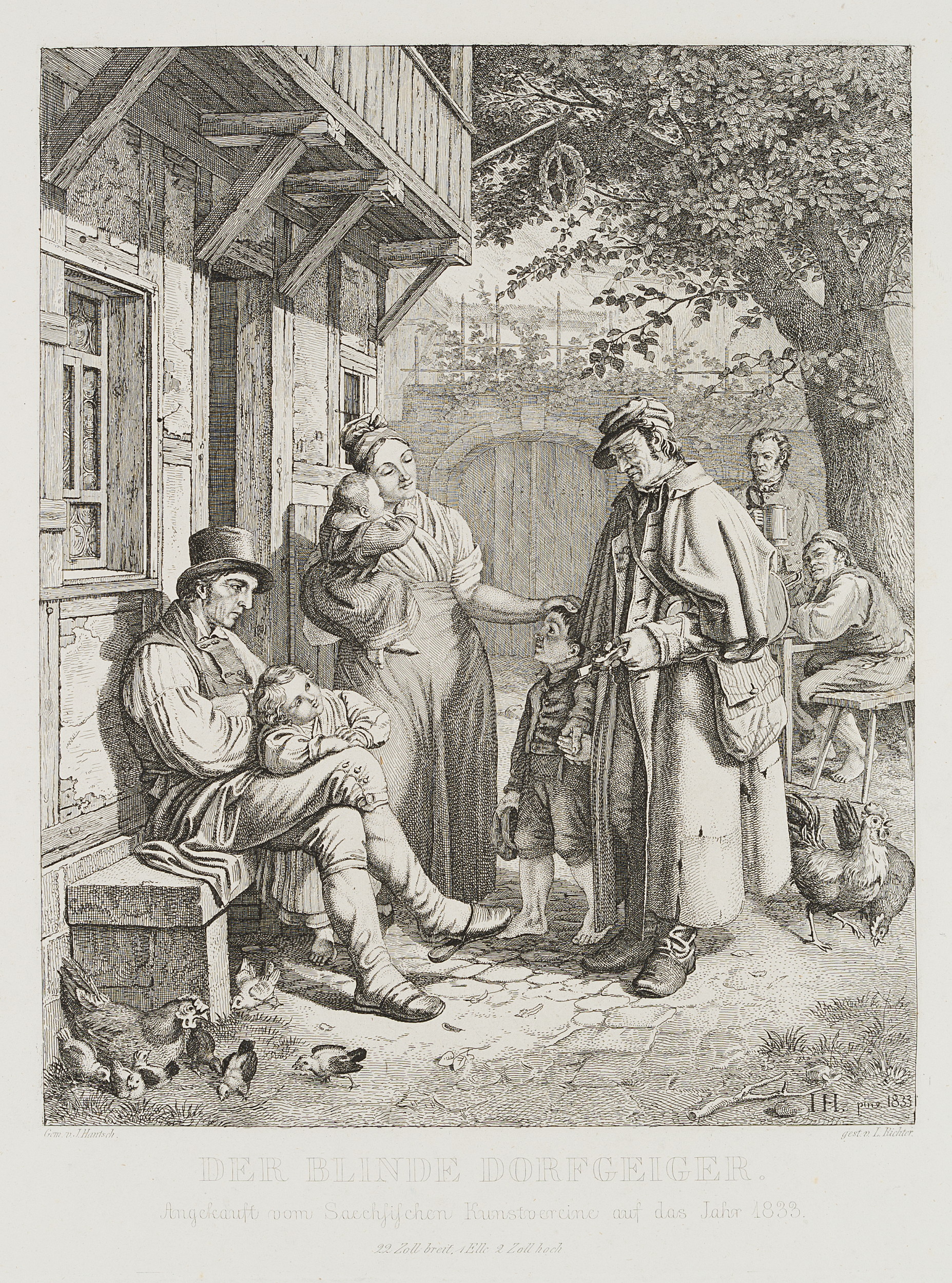 - Bezeichnung: Unten im Druck signiert: “Gem. v. Hantzsch / gest. v. L. Richter”. Unten im Druck bezeichnet: “Der blinde Dorfgeiger. Angekauft vom Saechischen Kunstvereine auf das Jahr 1833”.