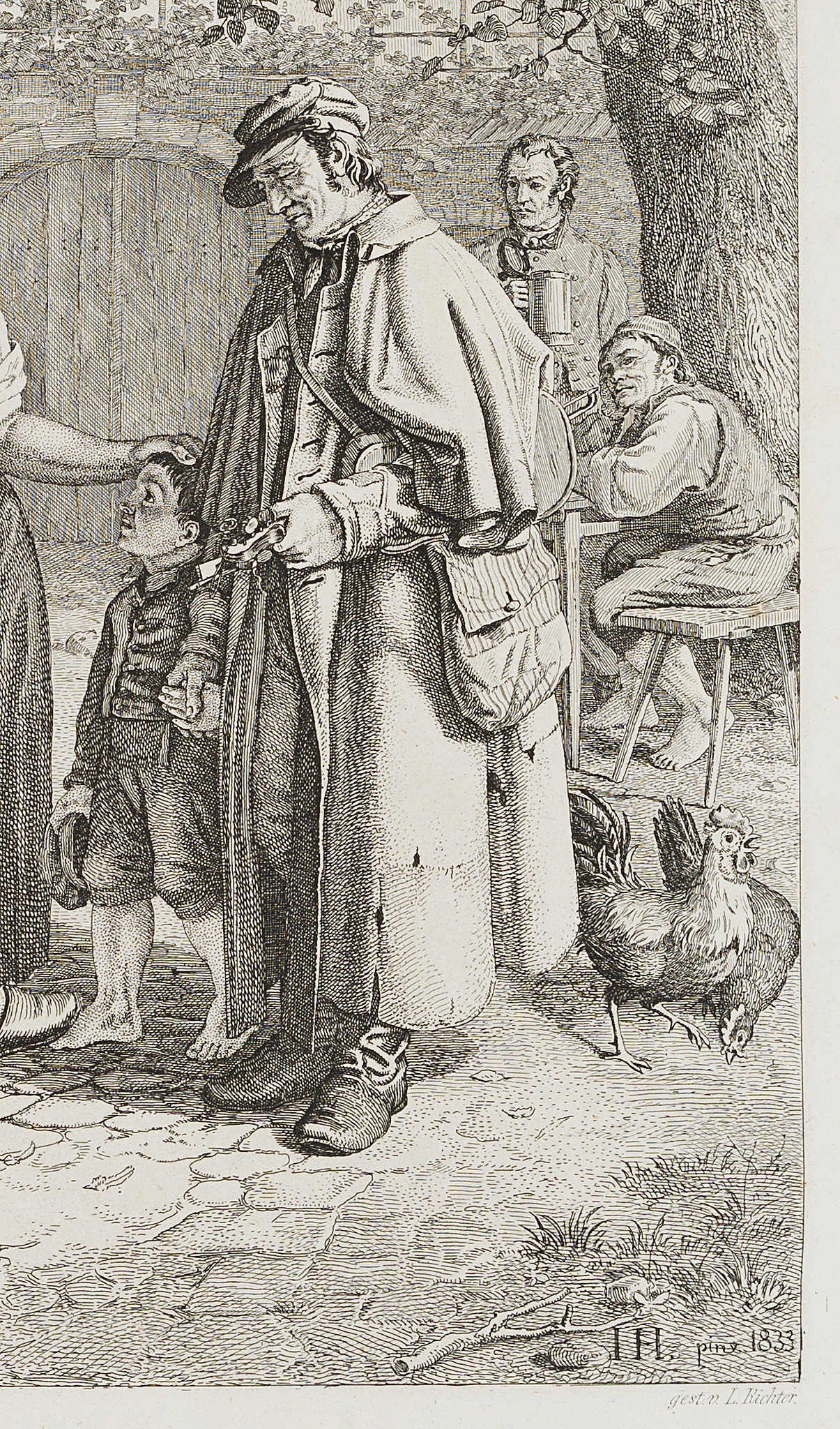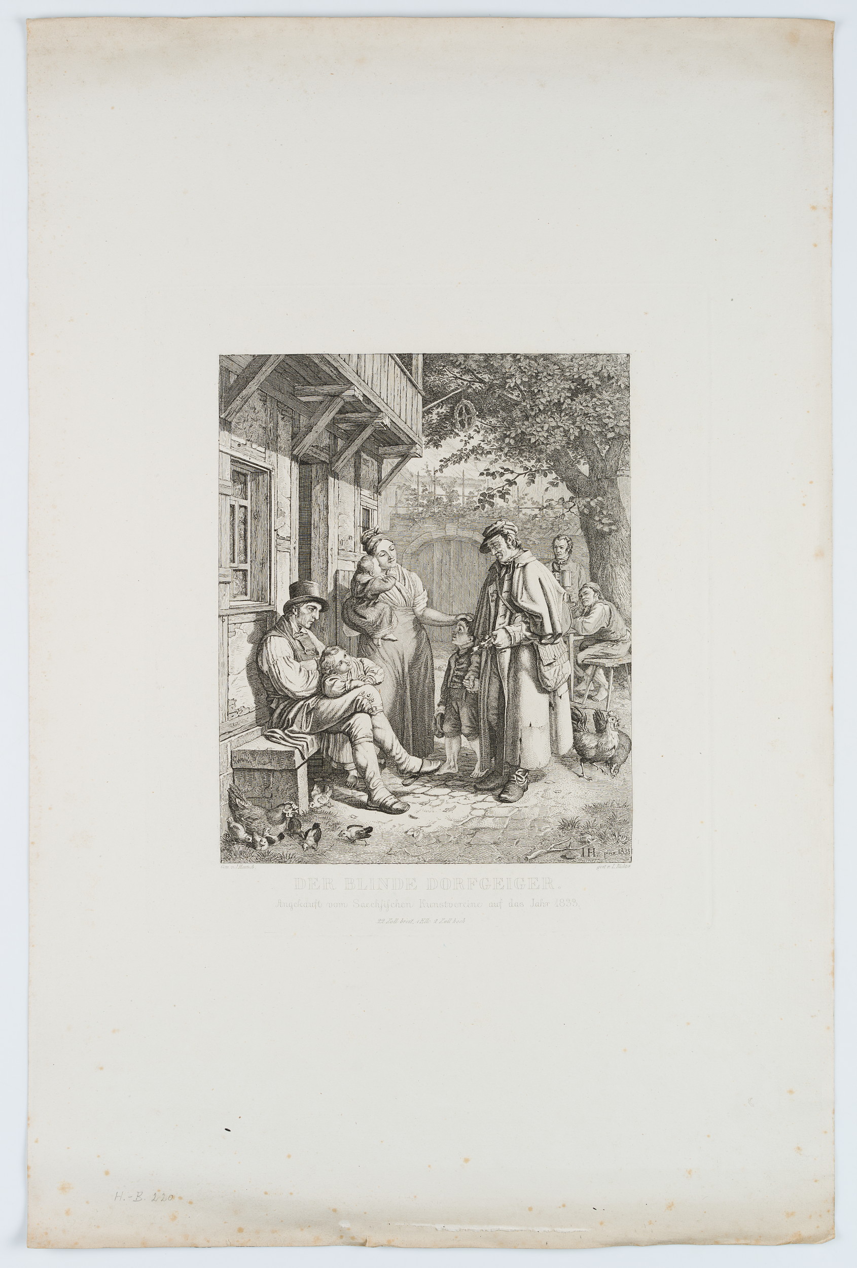 - Inscription: At the lower part signed in the printing plate: “Gem. v. Hantzsch / gest. v. L. Richter”. At the lower part inscribed in the printing plate: “Der blinde Dorfgeiger. Angekauft vom Saechischen Kunstvereine auf das Jahr 1833”.