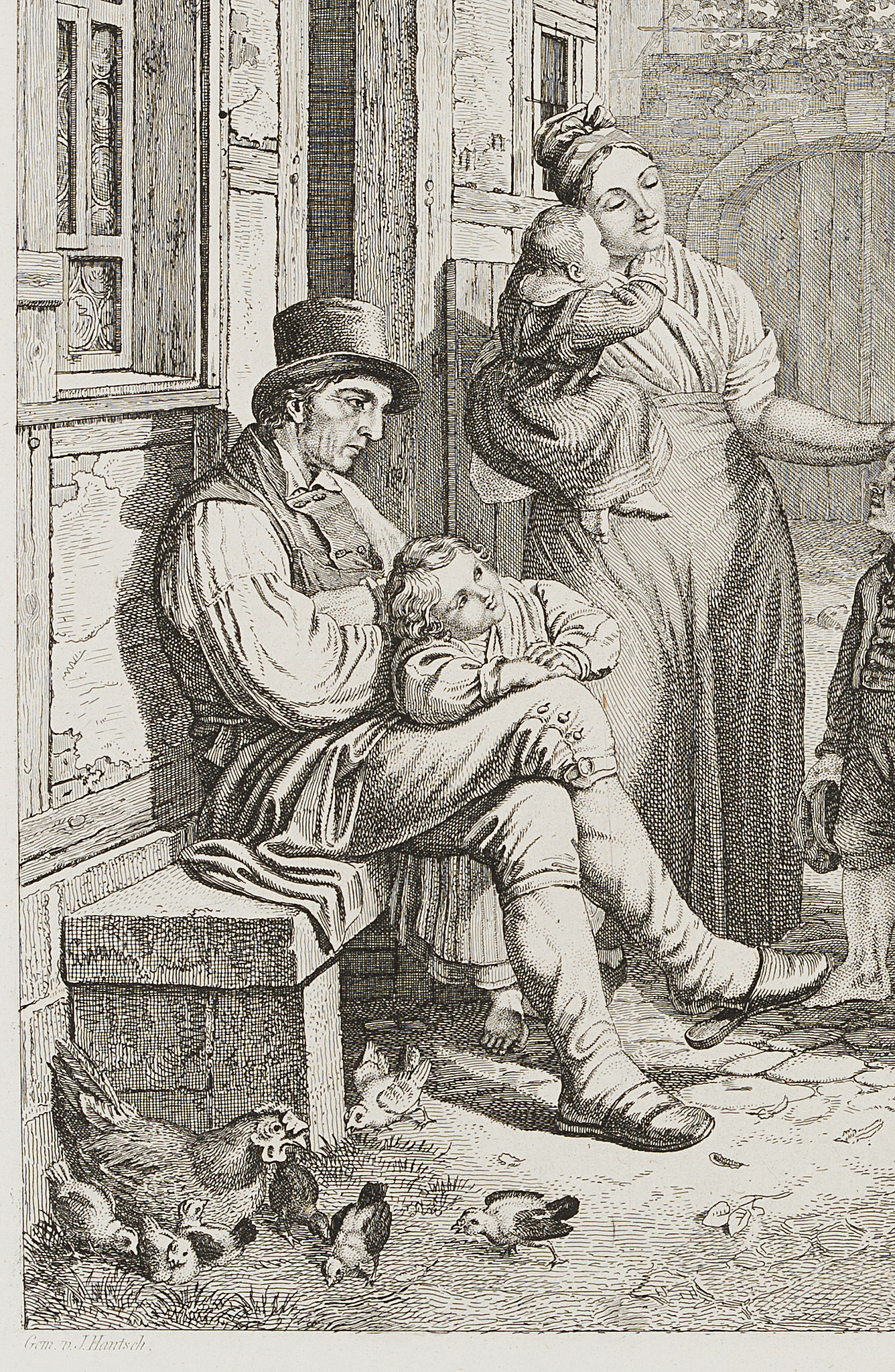 - Beschreibung: Intime Genreszene vor einem Bauernhaus.